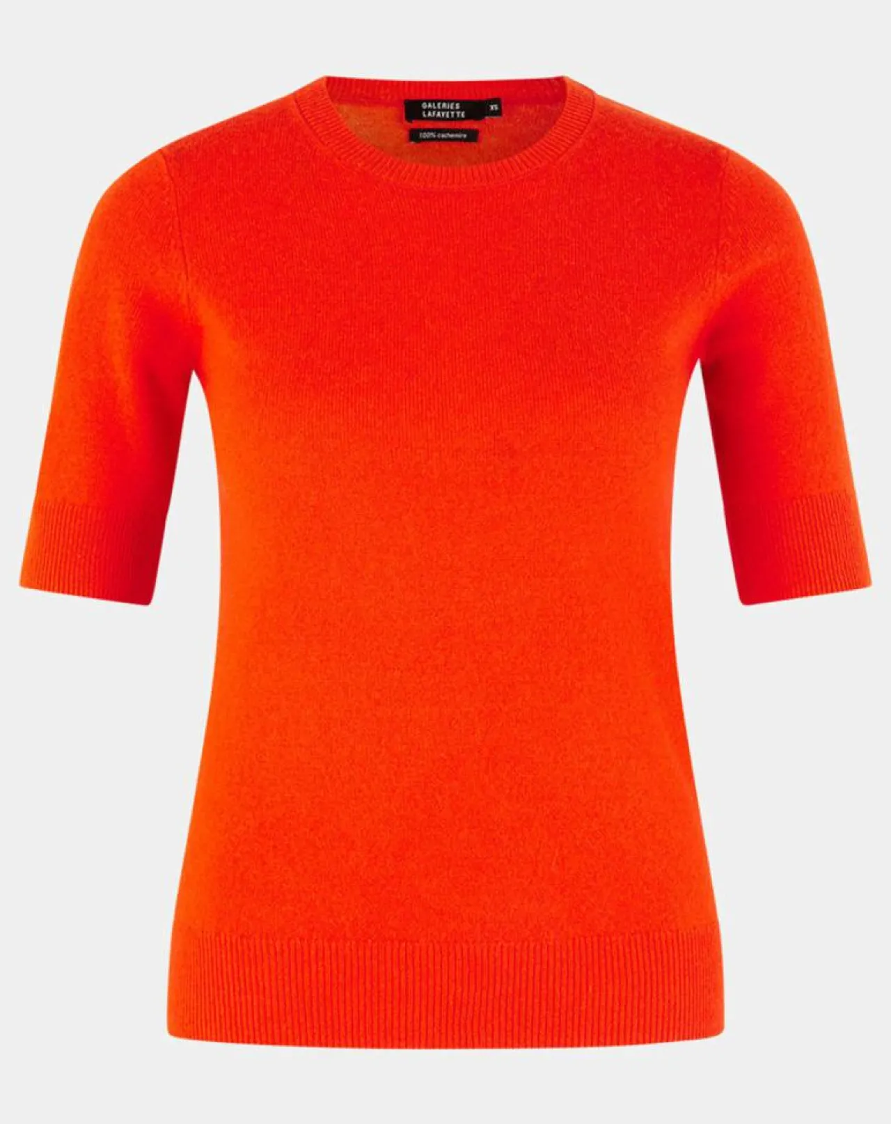 Ce pull droit Galeries Lafayette en cachemire est muni de manches courtes, d’un col rond et de finitions côtelées.