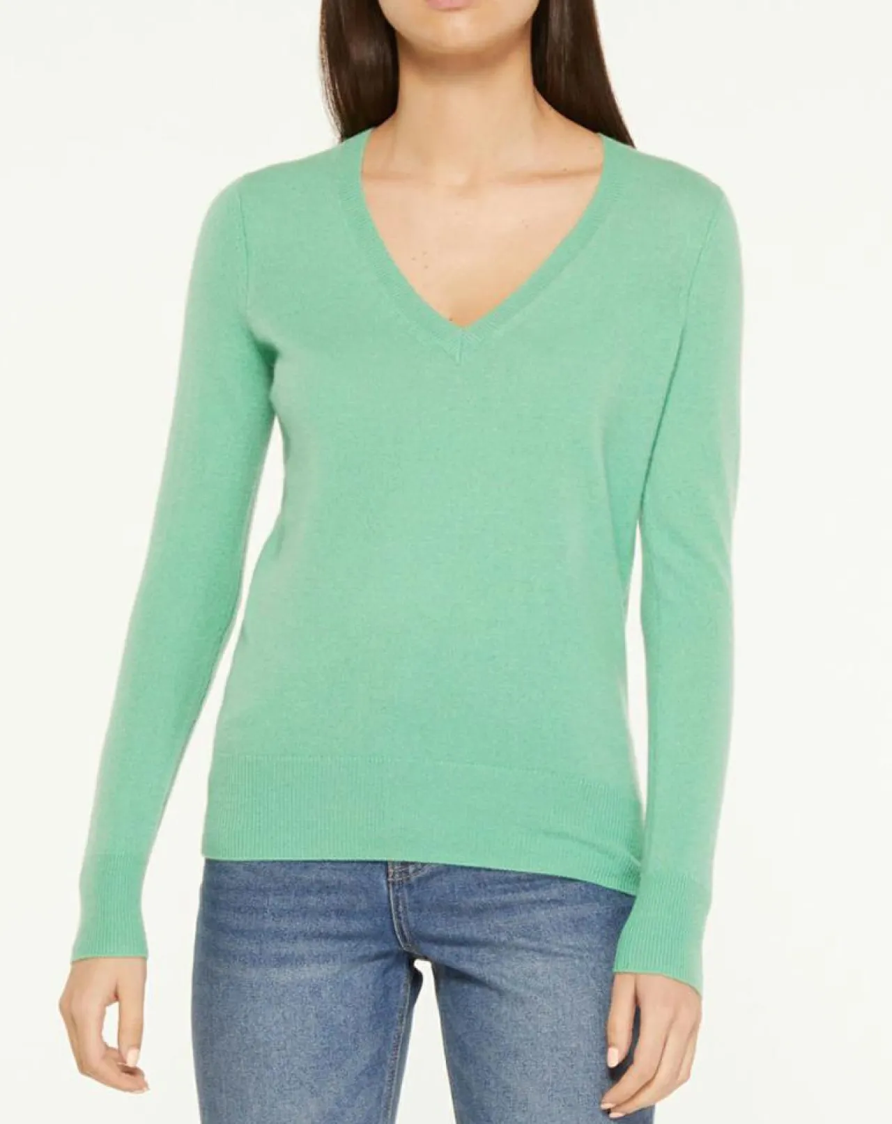 Ce pull droit Galeries Lafayette en cachemire est muni d’un col V et de finitions côtelées.