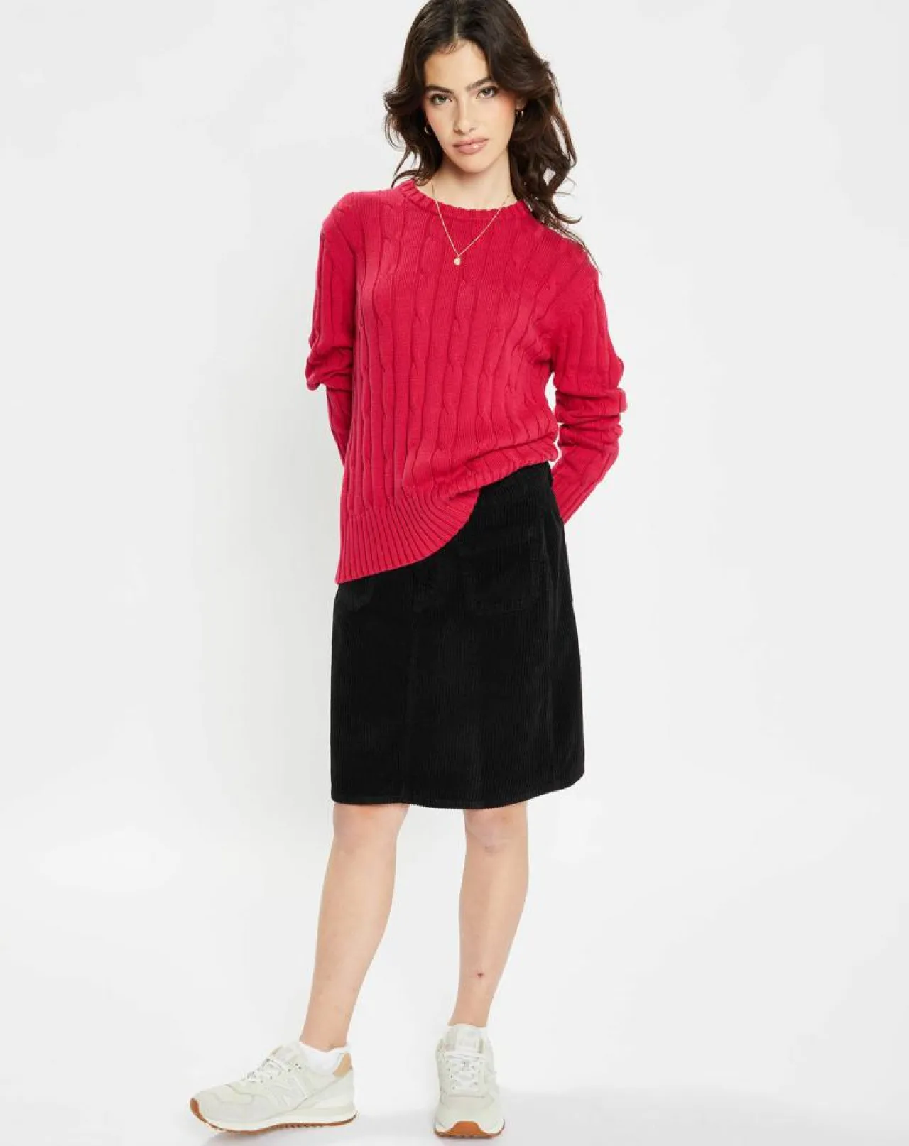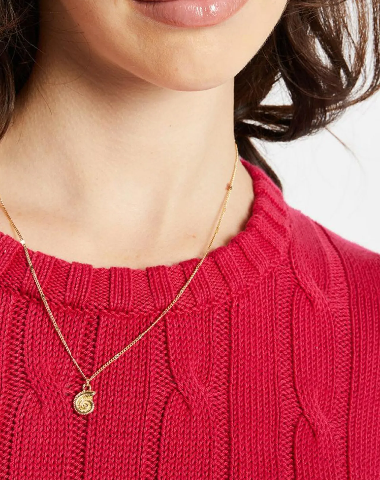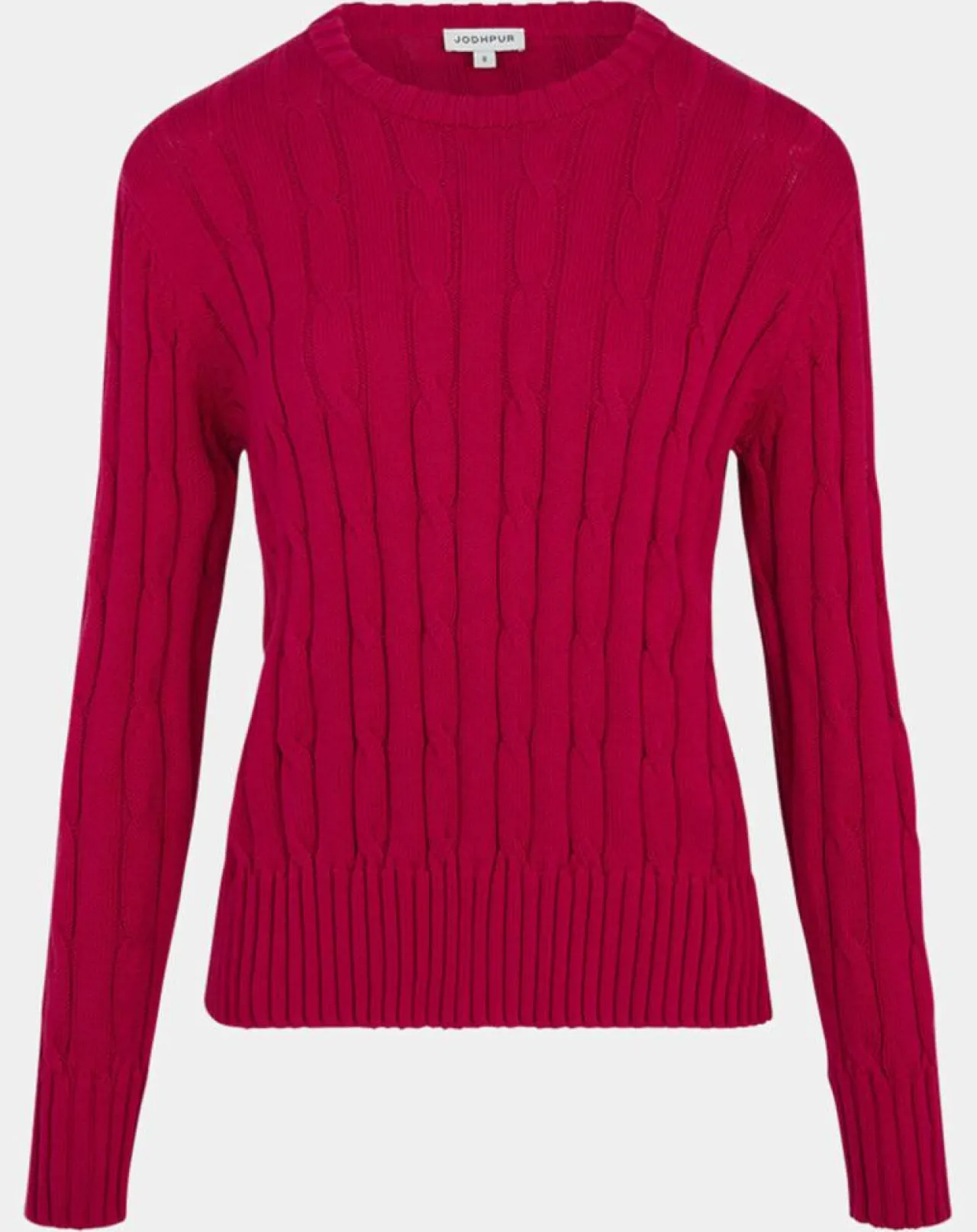 Ce pull droit Jodhpur en coton biologique est muni de torsades, d’un col rond et de finitions côtelées.