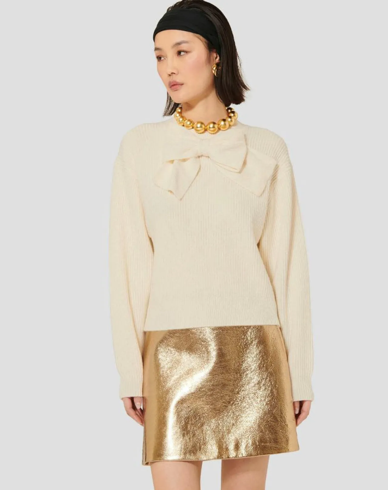 Ce pull en laine écru côtelé possède une encolure ronde et des manches longues