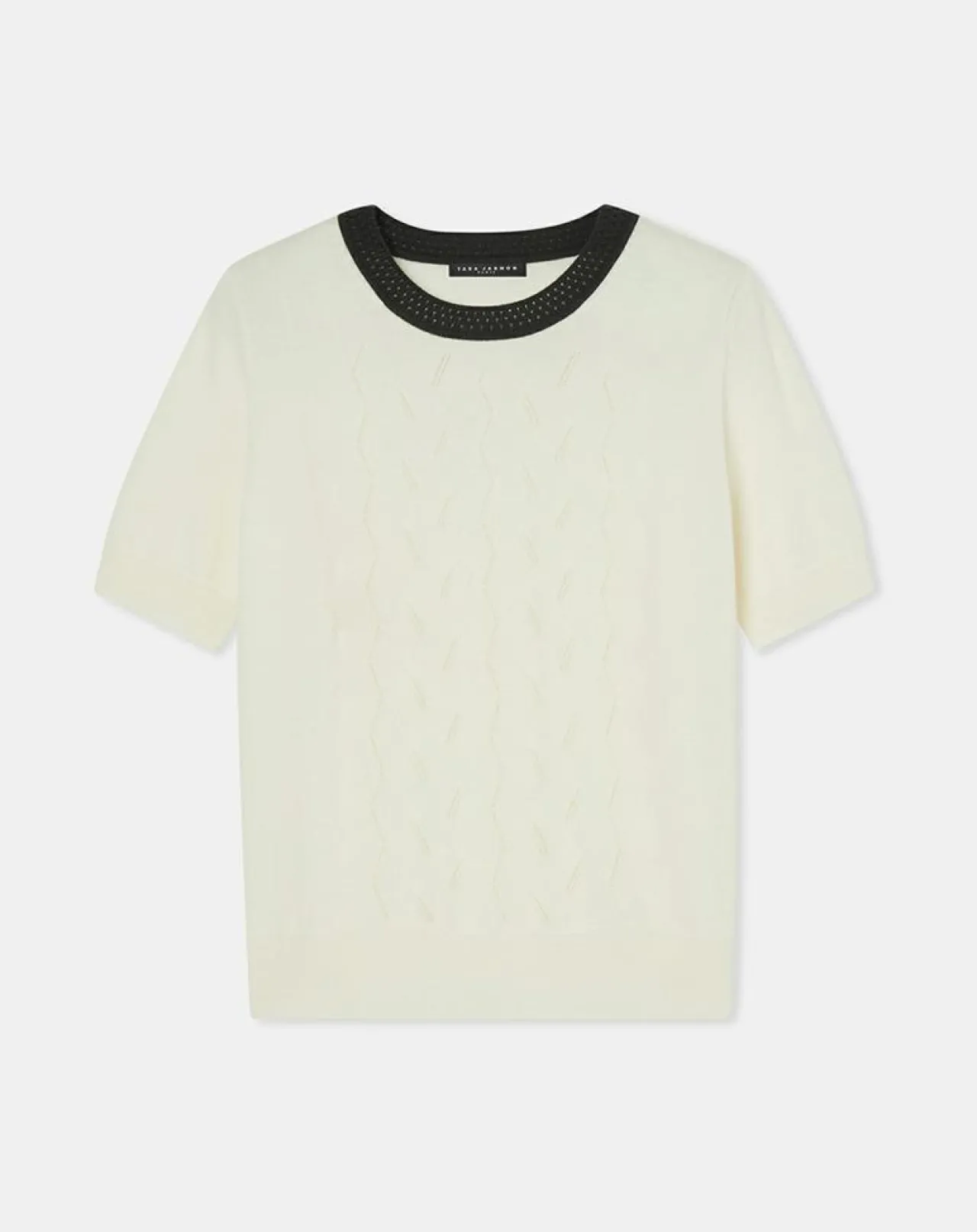 Ce pull court écru en laine possède des manches courtes et un col rond contrastant avec sa couleur noire