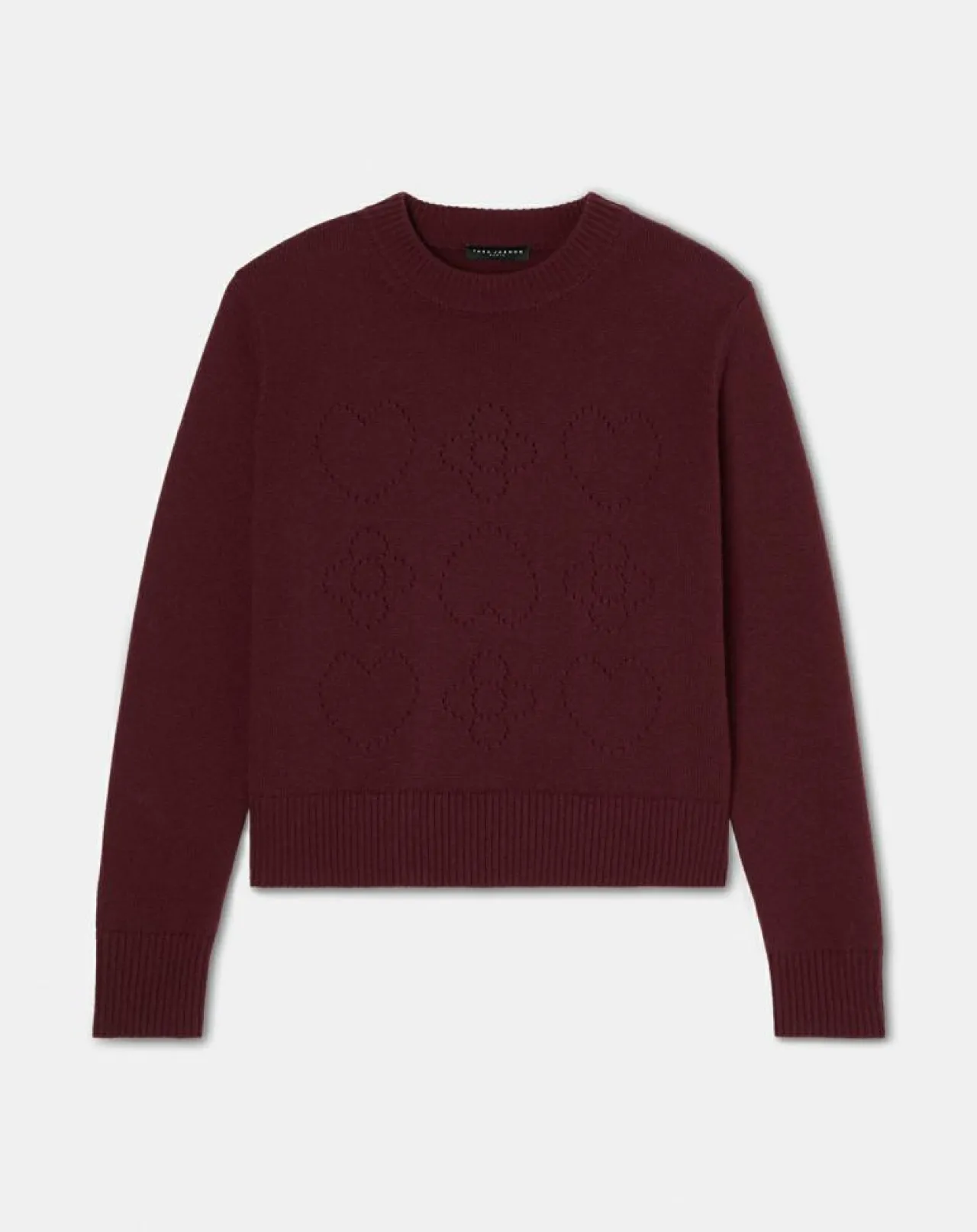 Des surpiqures décorent l’avant du pull formant des fleurs et des curs, so Tara.
