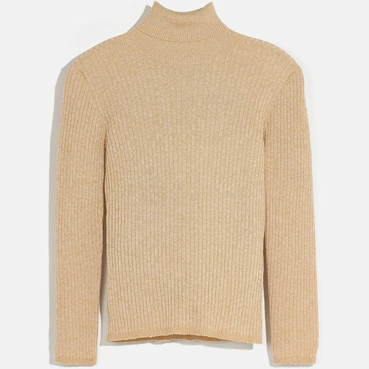 Ce pull slim à col roulé est fabriqué en viscose mélangée avec juste ce qu’il faut de lurex pour faire briller le tout sans rien perdre en douceur