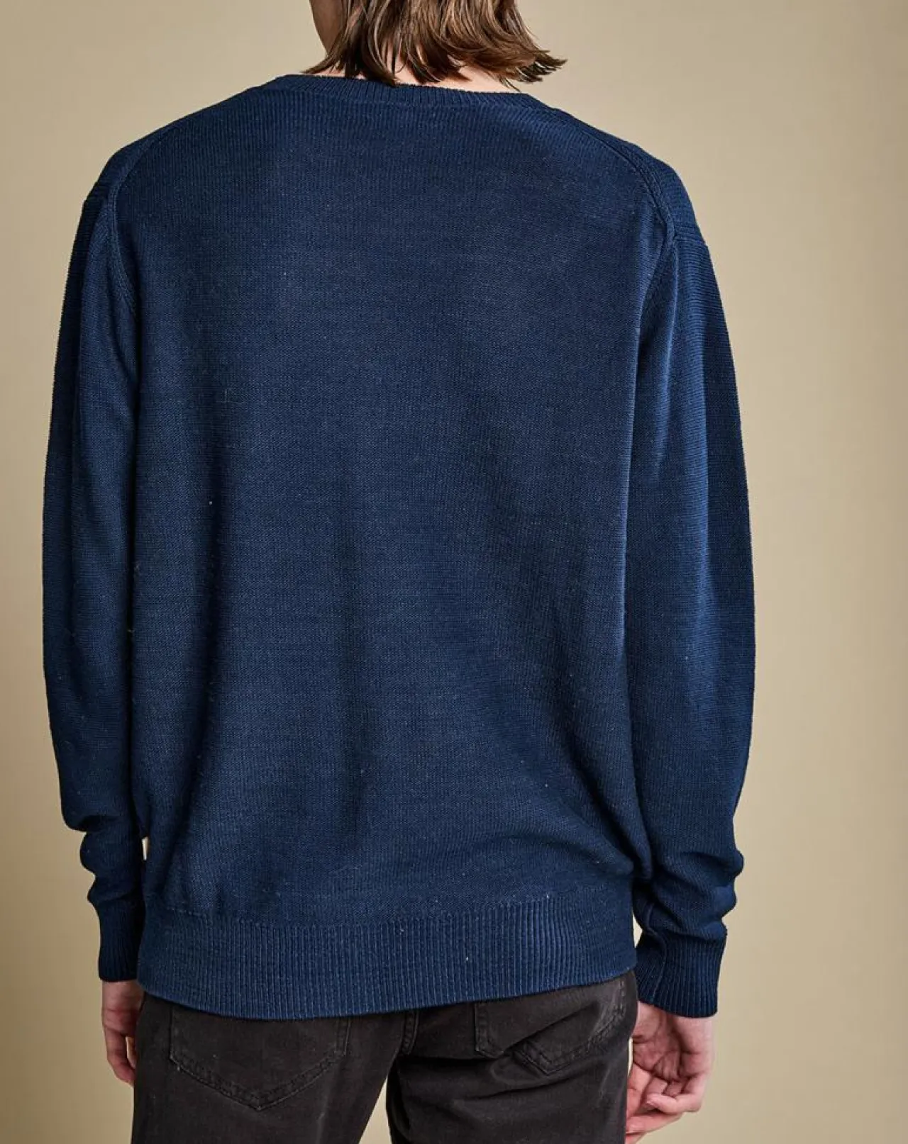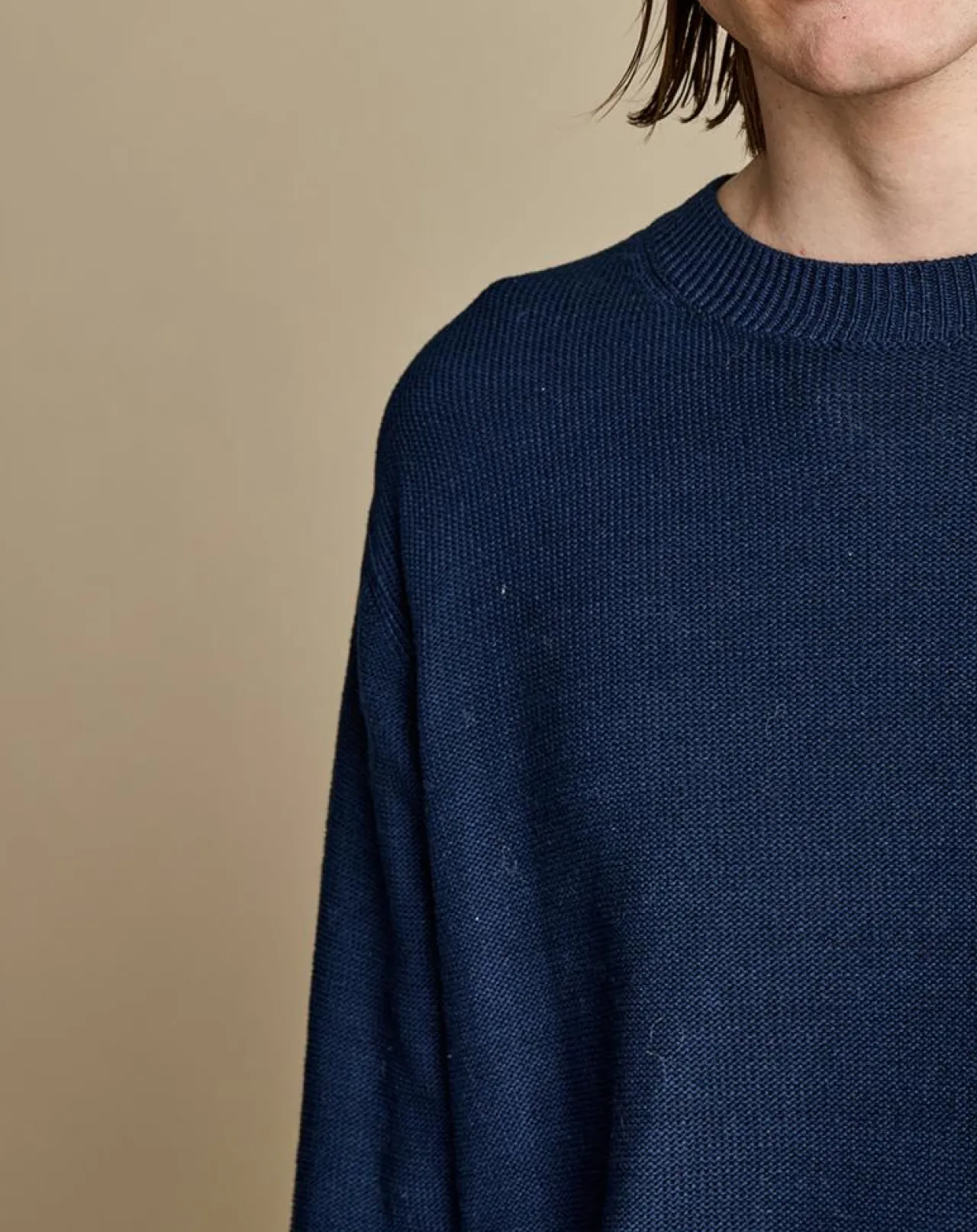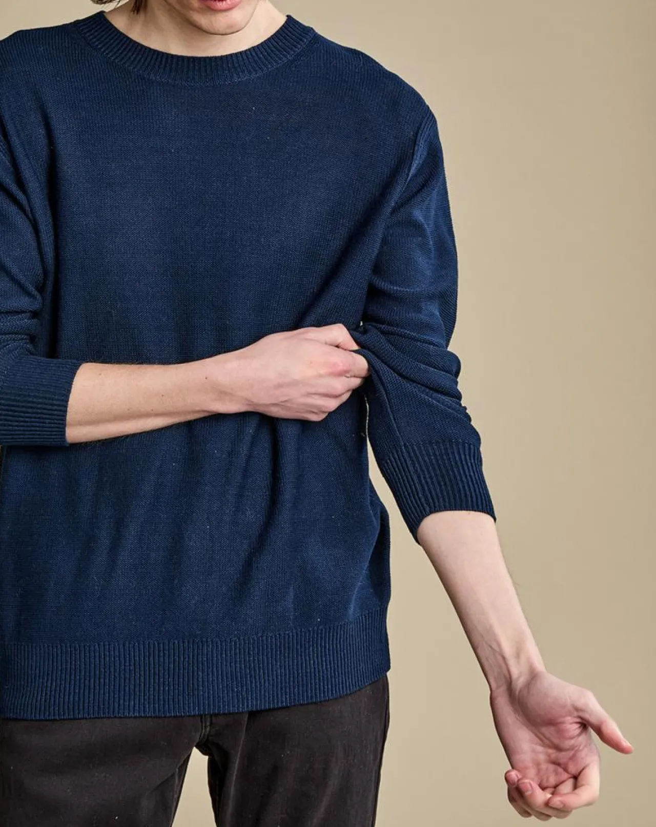 Ce pull en pur coton bleu marine tricoté sur l’envers présente une coupe versatile et intemporelle