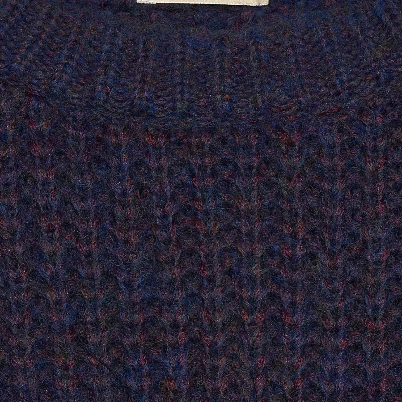 Tricoté à partir d’un mélange italien de laine et de fibres recyclées, il séduit d’abord par sa teinte raffinée aux nuances de bleu et d’indigo