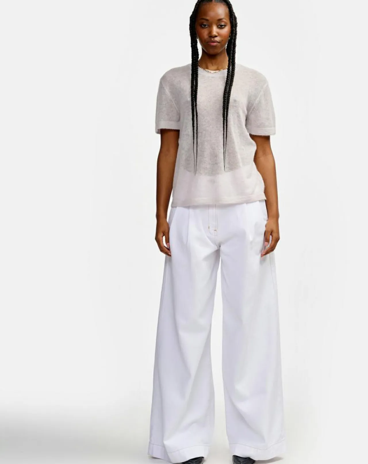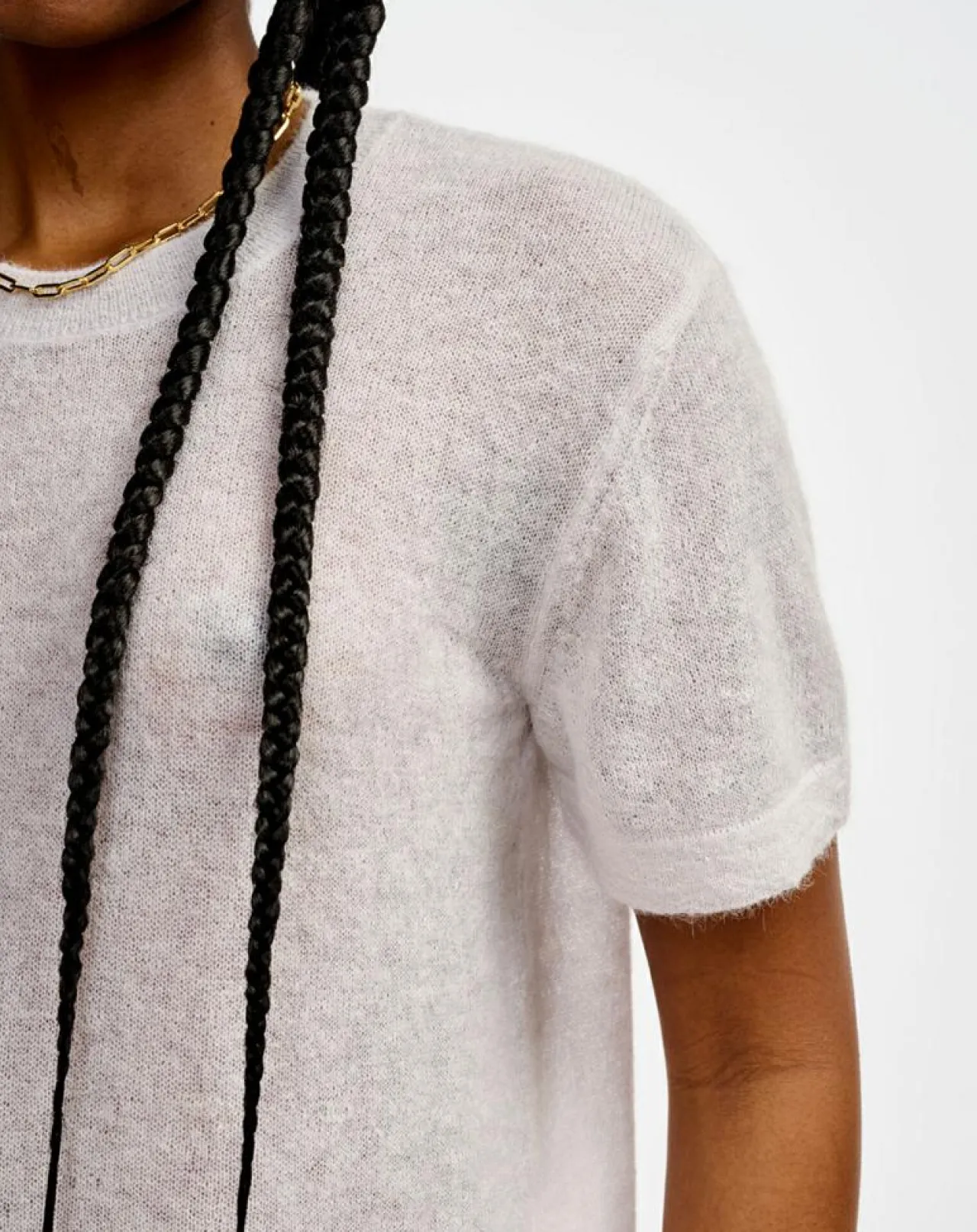 A mi-chemin entre le t-shirt et le pull, Atiss est un bon complément pour vos looks superposés. Ce modèle ultra-léger est tricoté à partir de laine alpaga superfine, tellement fine qu’on le porte volontiers en plein été par-dessus un débardeur et un jean.