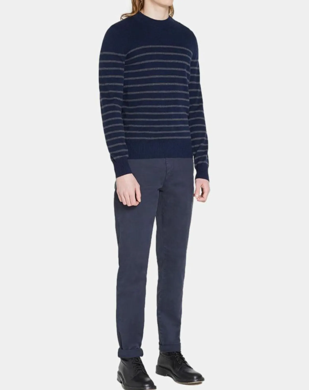 Ce pull ajusté Galeries Lafayette composé de laine et cachemire, présente un col rond, une fermeture boutonnée sur l’épaule gauche, des fines rayures, des manches longues et une maille côtelée.