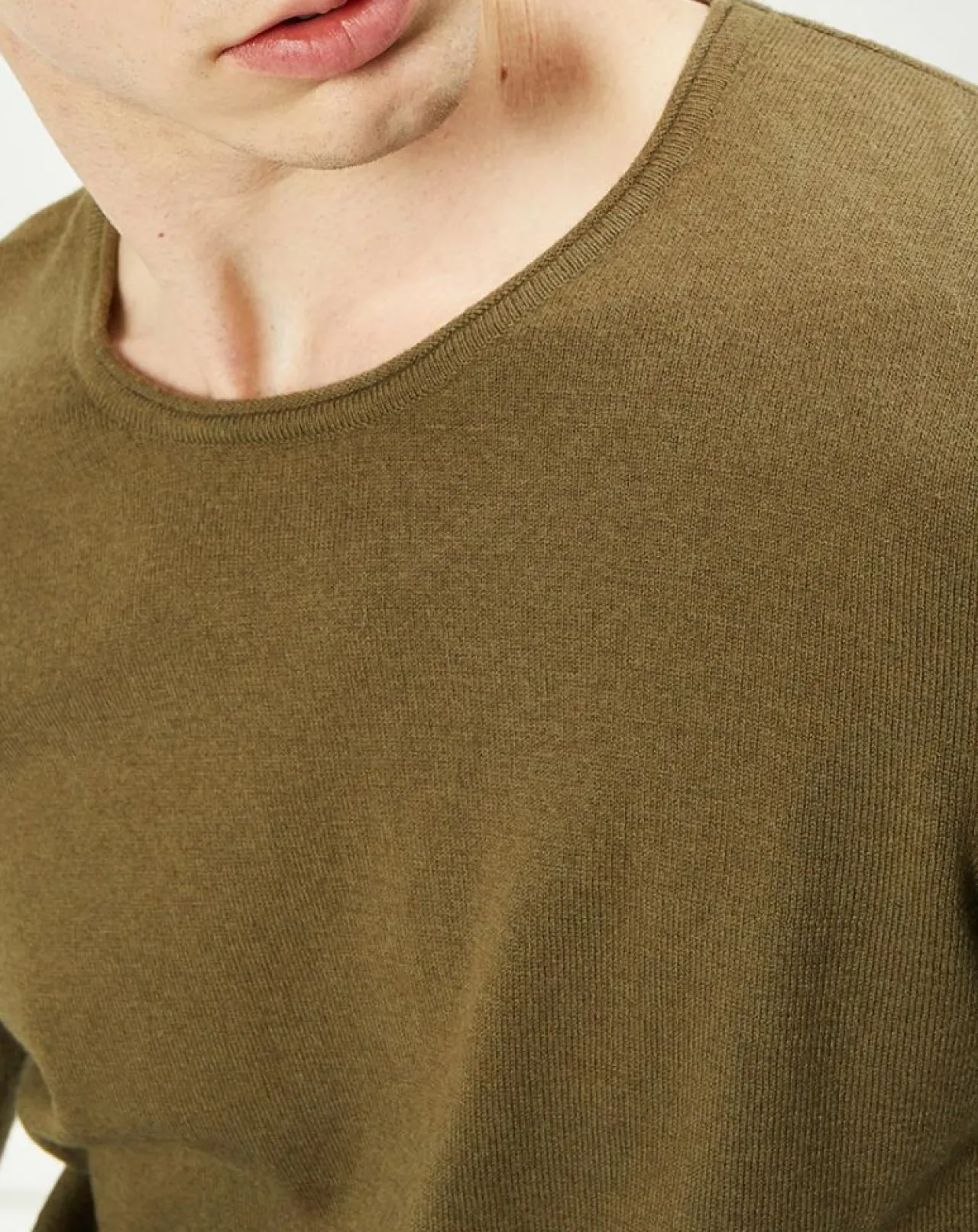 Pull col rond , finition roulottée à l’encolure, au bas des manches et du pull