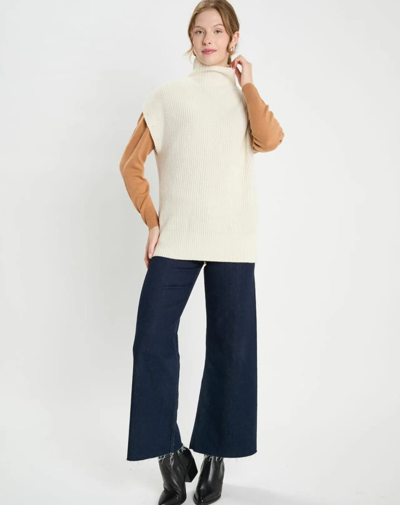 Ce pull sans manches Galeries Lafayette en laine et cachemire est muni d’un col montant et de finitions côtelées.