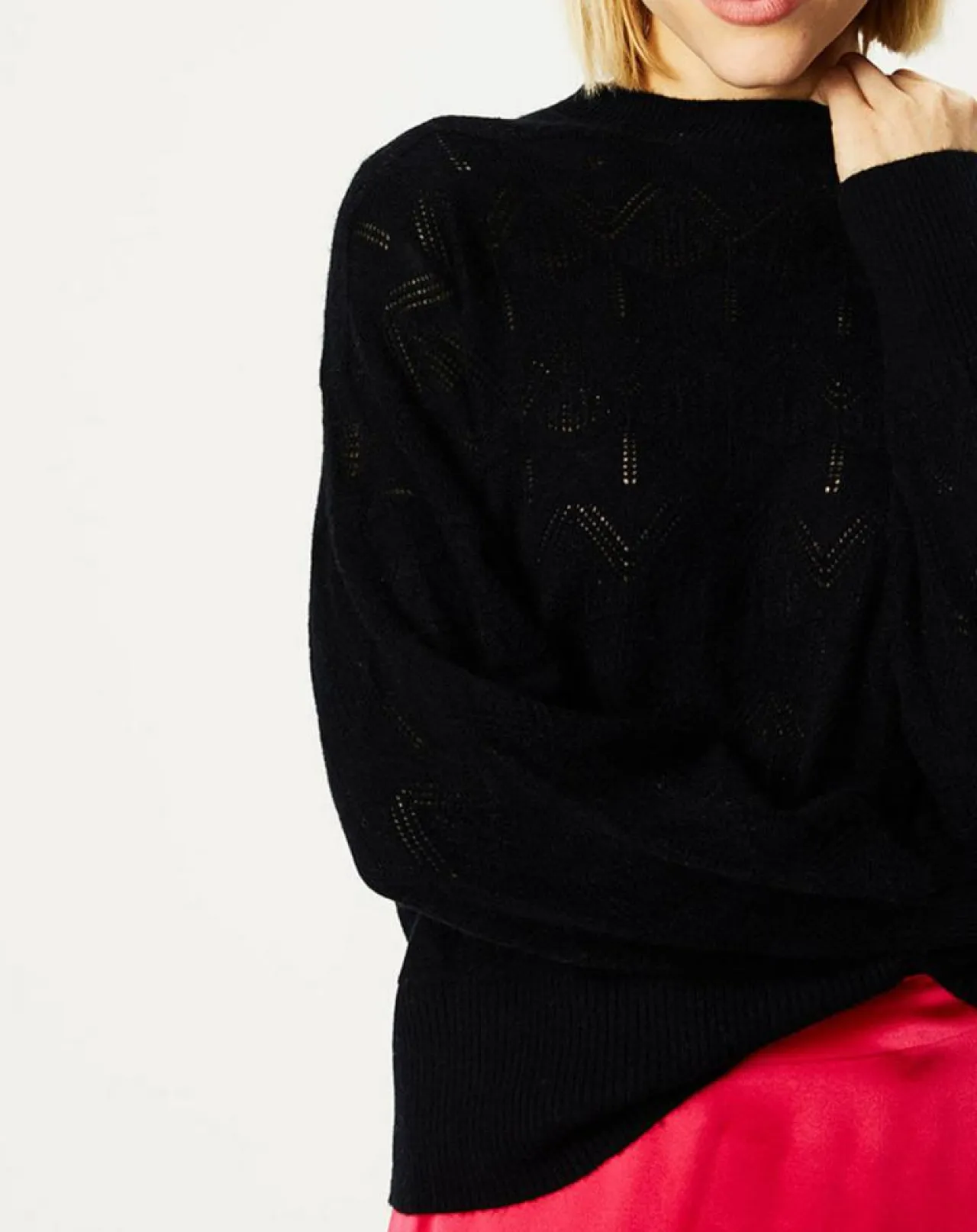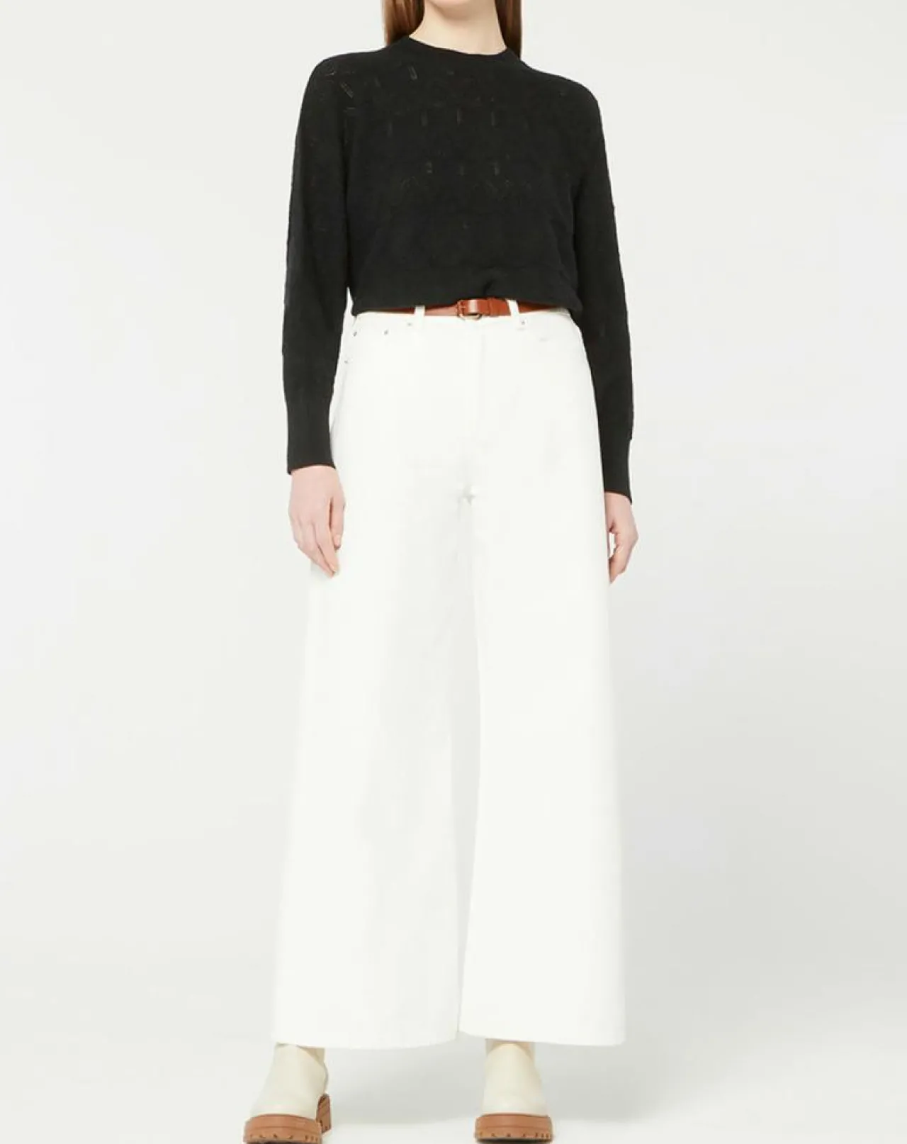 Ce pull court ample Galeries Lafayette en laine et cachemire à motif ajouré, est muni d’un col rond, de manches longues et de finitions côtelées.