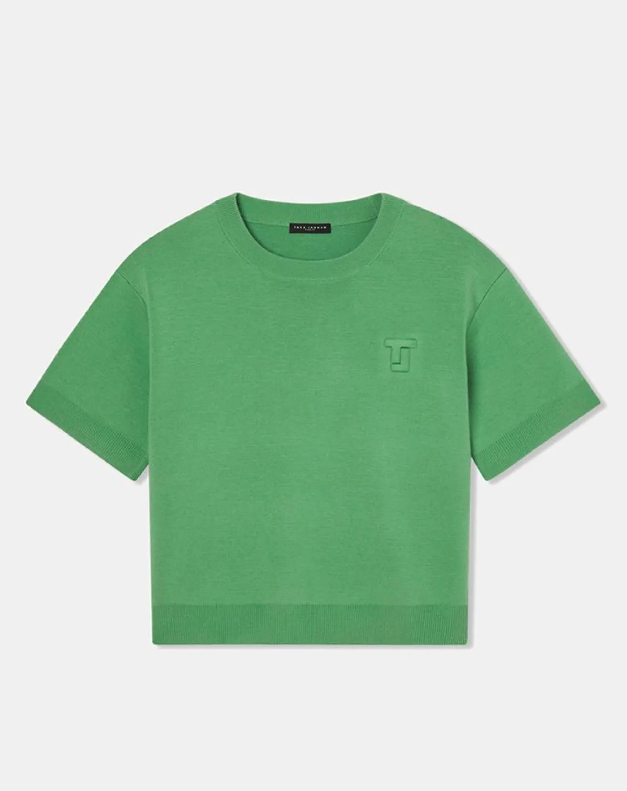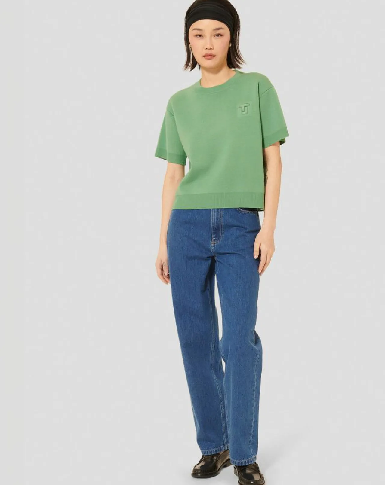 Ce pull couleur amande en laine mérinos possède une coupe droite, une encolure ronde et des manches courtes