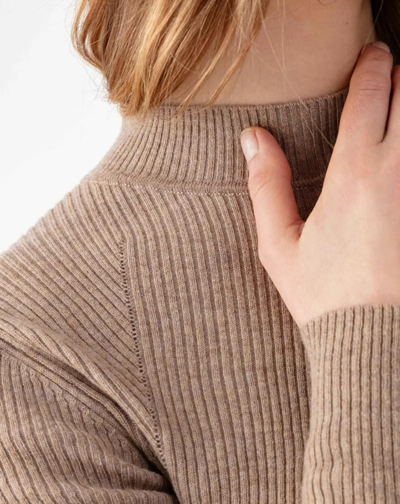 Cette saison, la maille INDIES se réinvente dans un pull chaussette beige près du corps, le pull TALITHA