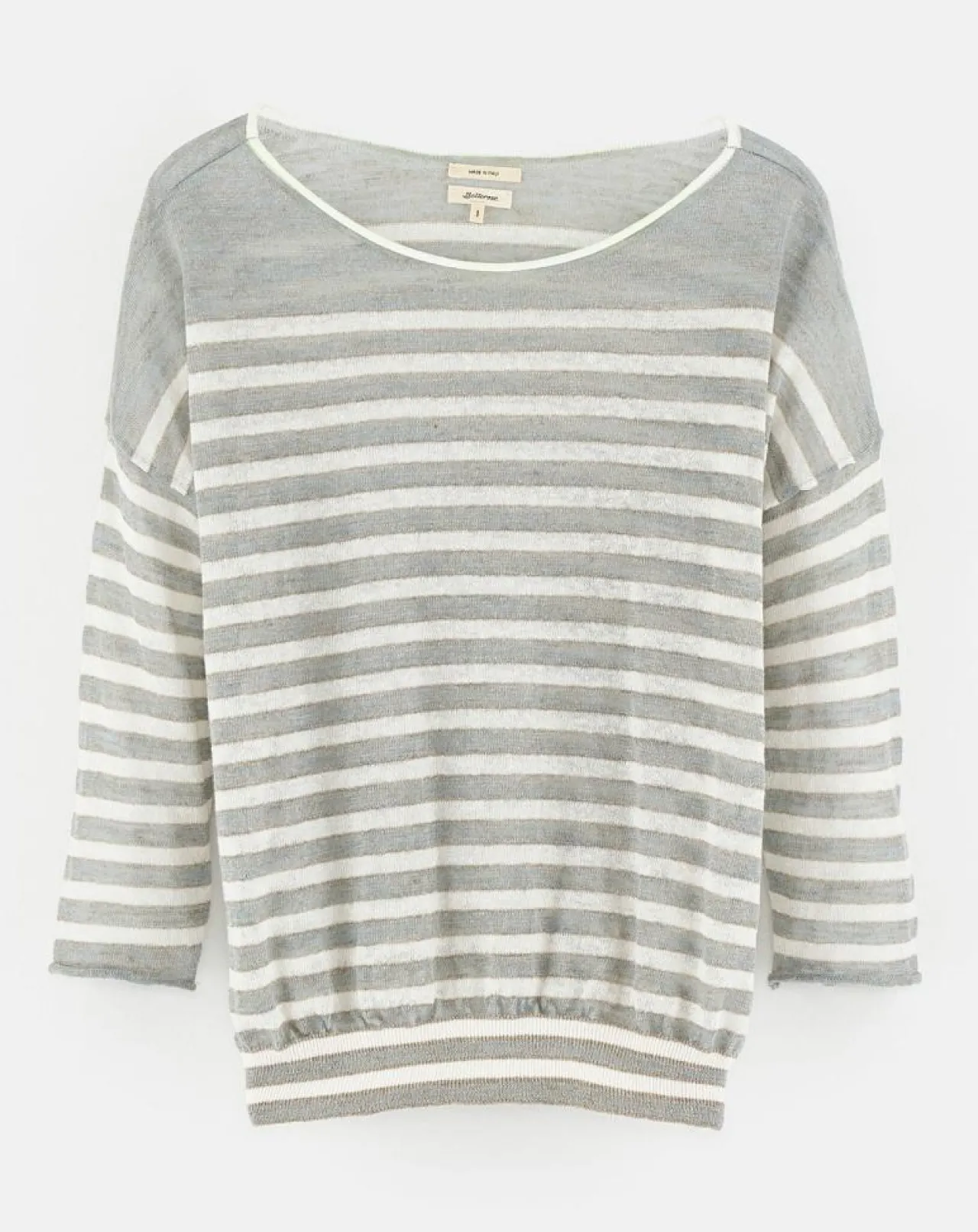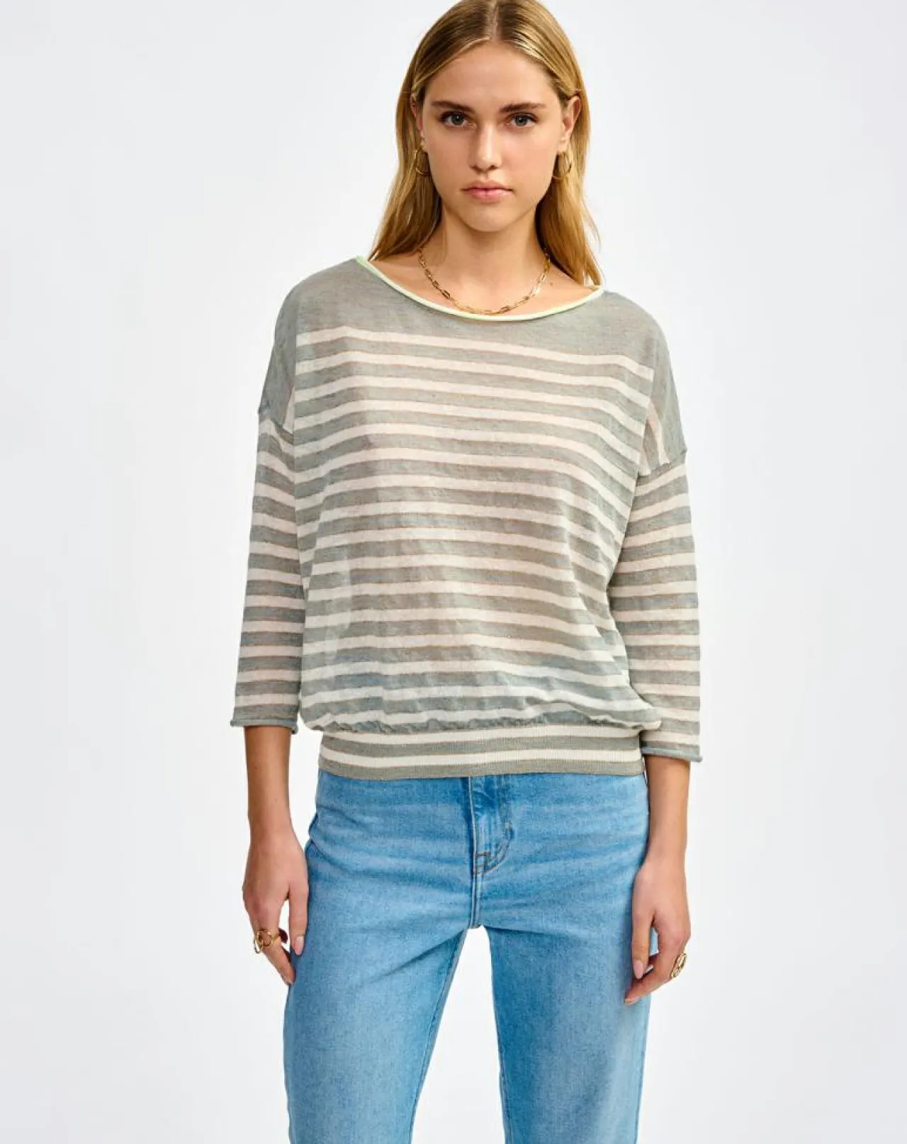 Doux, respirant et léger, Neep est un pull idéal pour l’été. Cette marinière en lin mélangé est dotée d’un col bateau roulotté contrastant, d’épaules tombantes et de manches 3/4. Ses rayures pâles à bords dorés iront à merveille avec vos pantalons clairs.