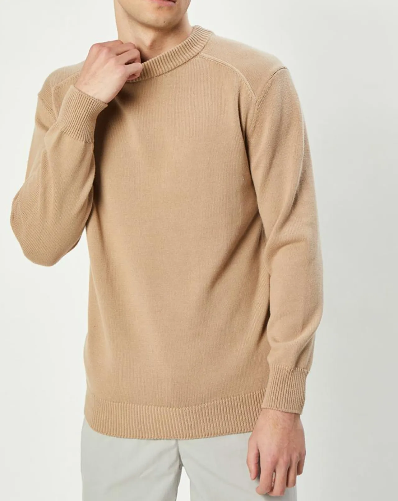 Ce pull est tricoté en pur coton avec une coupe décontractée, un col en tricot double et des épaules inclinées