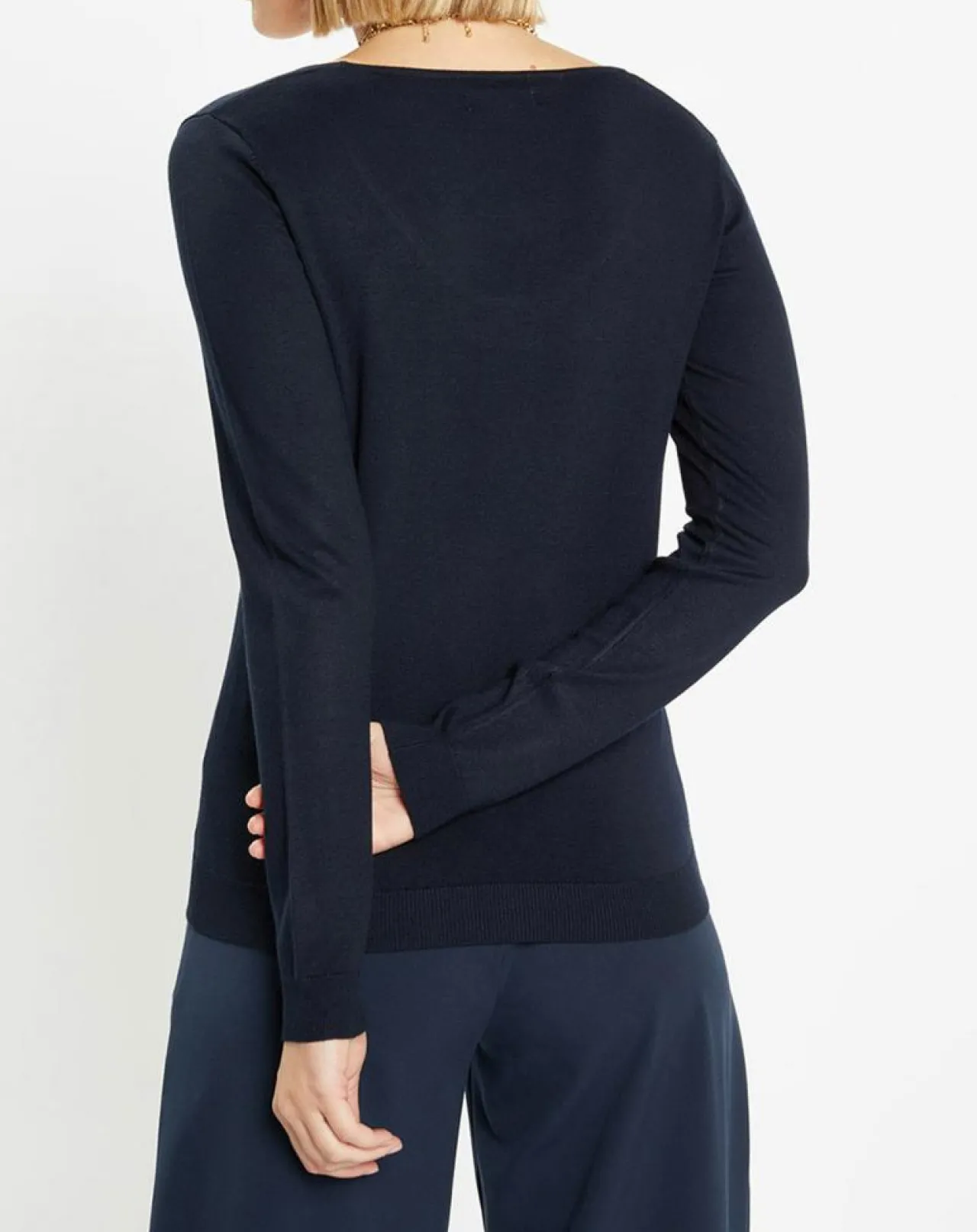 Ce pull droit en fine maille Galeries Lafayette est muni d’un grand col rond et de finitions côtelées.