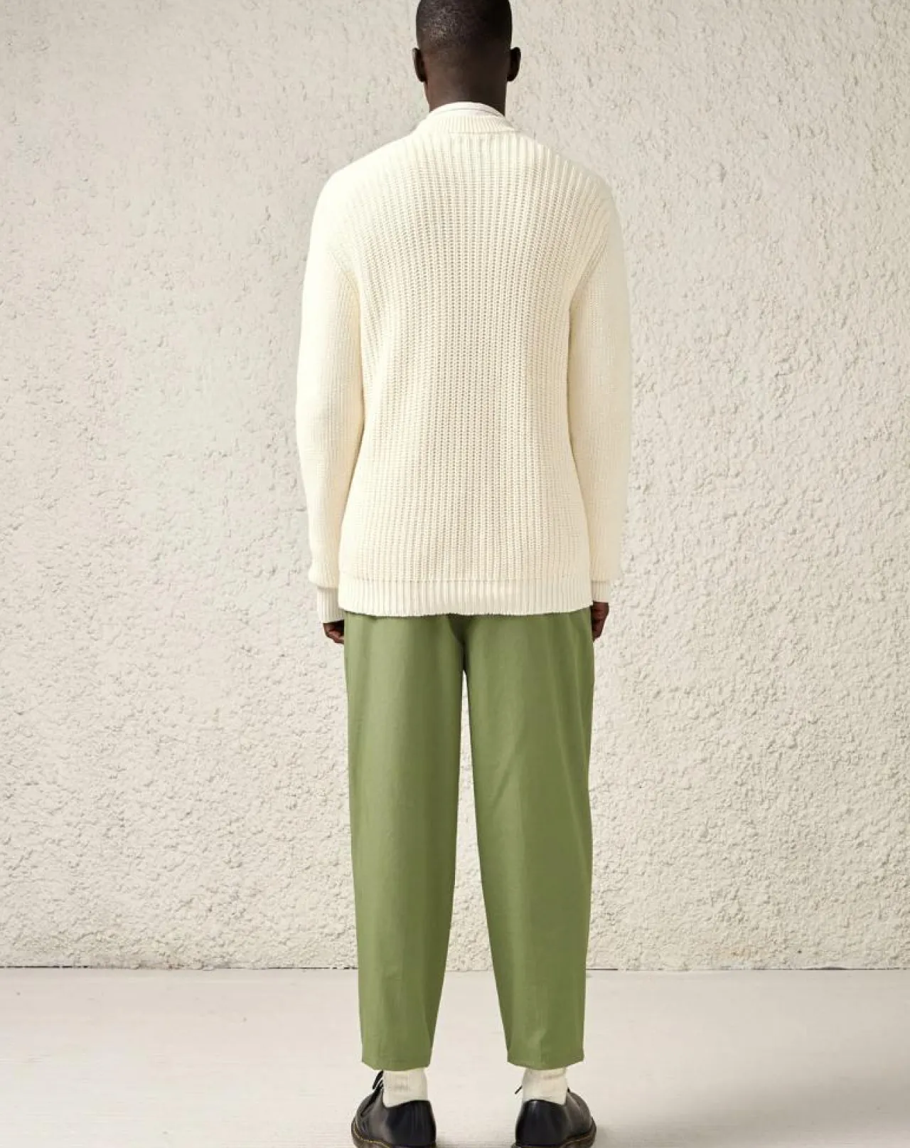 Tricoté en coton 13 fils (gauje 5 pour plus de tenue) avec une coupe décontractée, une encolure ras du cou minimaliste et des manches marteau, c’est un intemporel qui traverse les saisons.