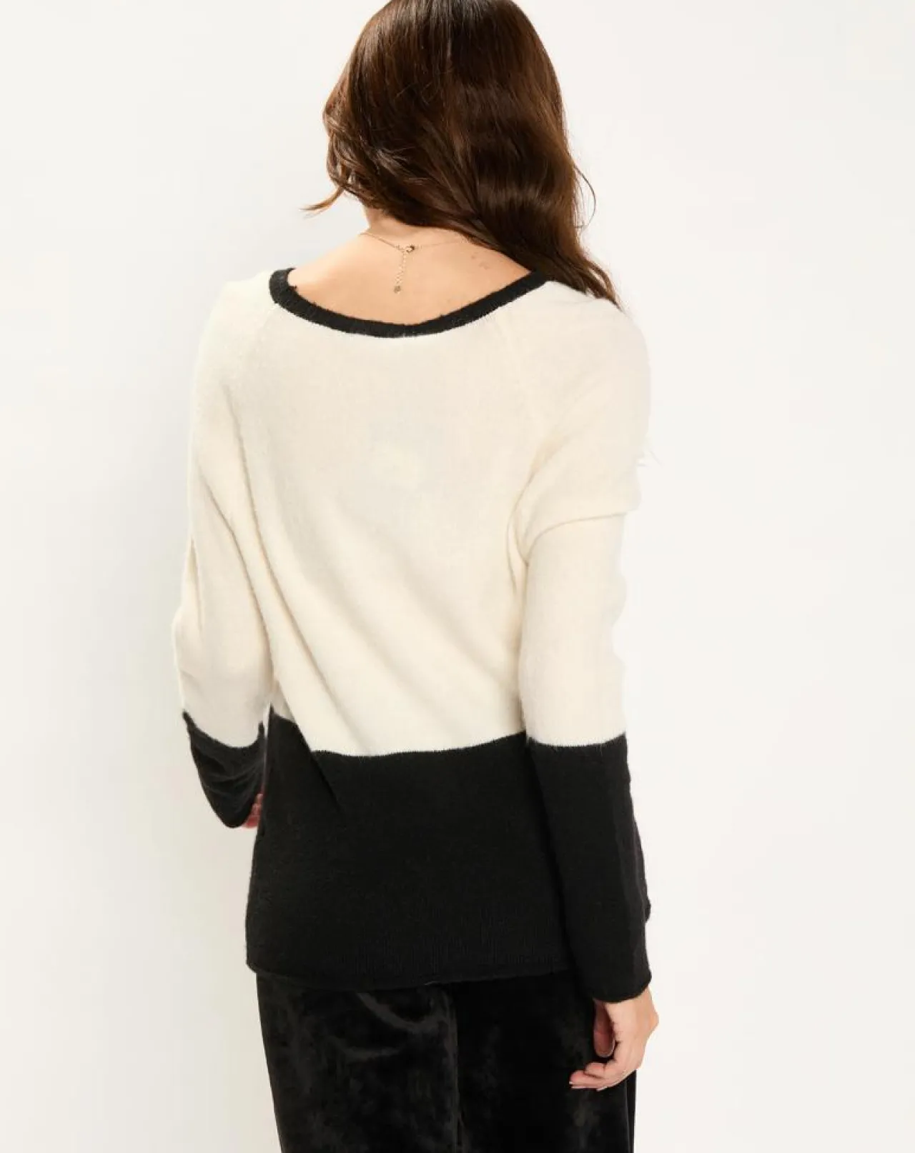 Le haut du pull est écru, le bas du corps et des manches sont noirs