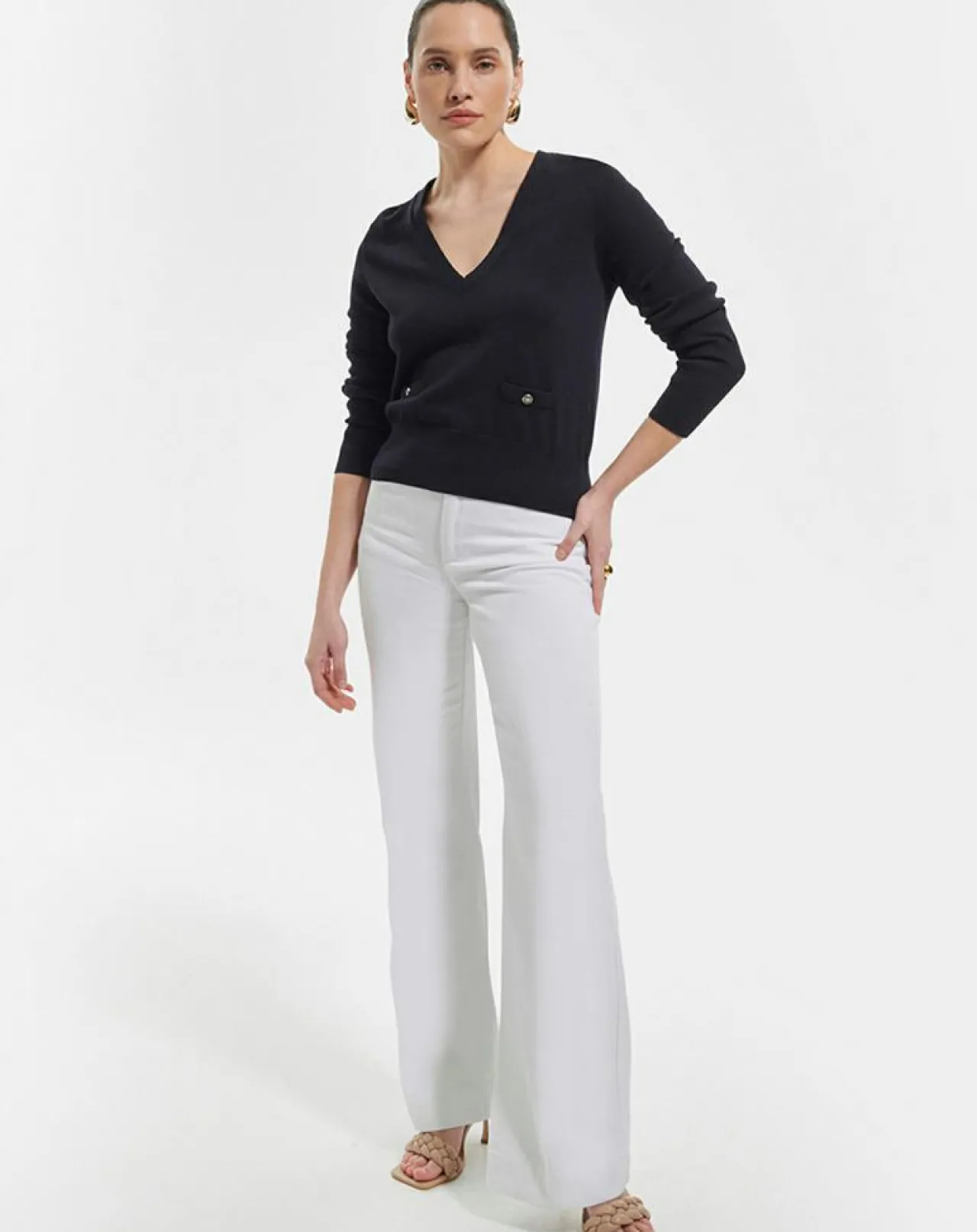 Pull ajusté avec un col en V flatteur et des manches longues, offrant une silhouette élégante et ajustée