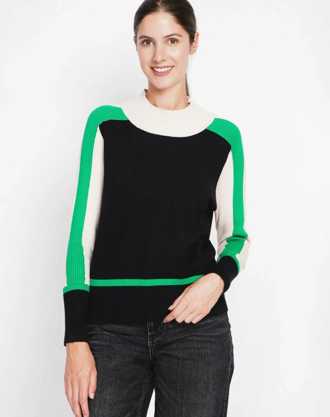 Pull col montant en tri-couleur coupe oversize à manches longues