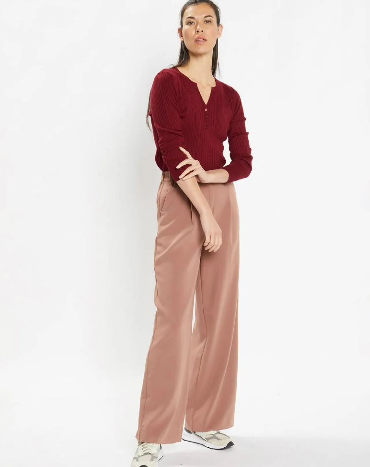 Ce pull ajusté Galeries Lafayette en maille stretch côtelée est muni d’un col tunisien boutonné ainsi que de manches longues.