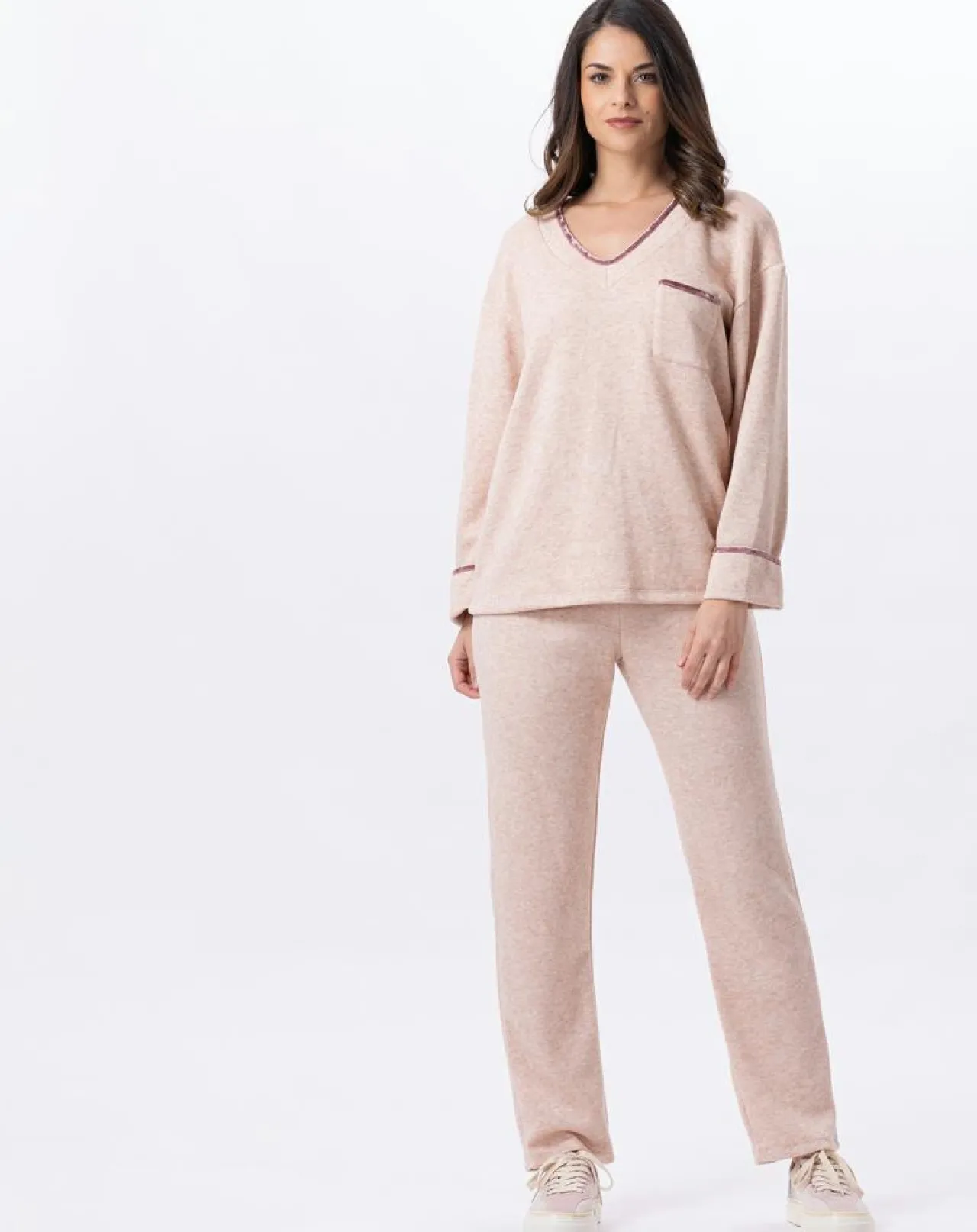 Il est l’ensemble homewear par excellence ! Dans l’esprit d’un jogging féminin, le top présente un volume ample.