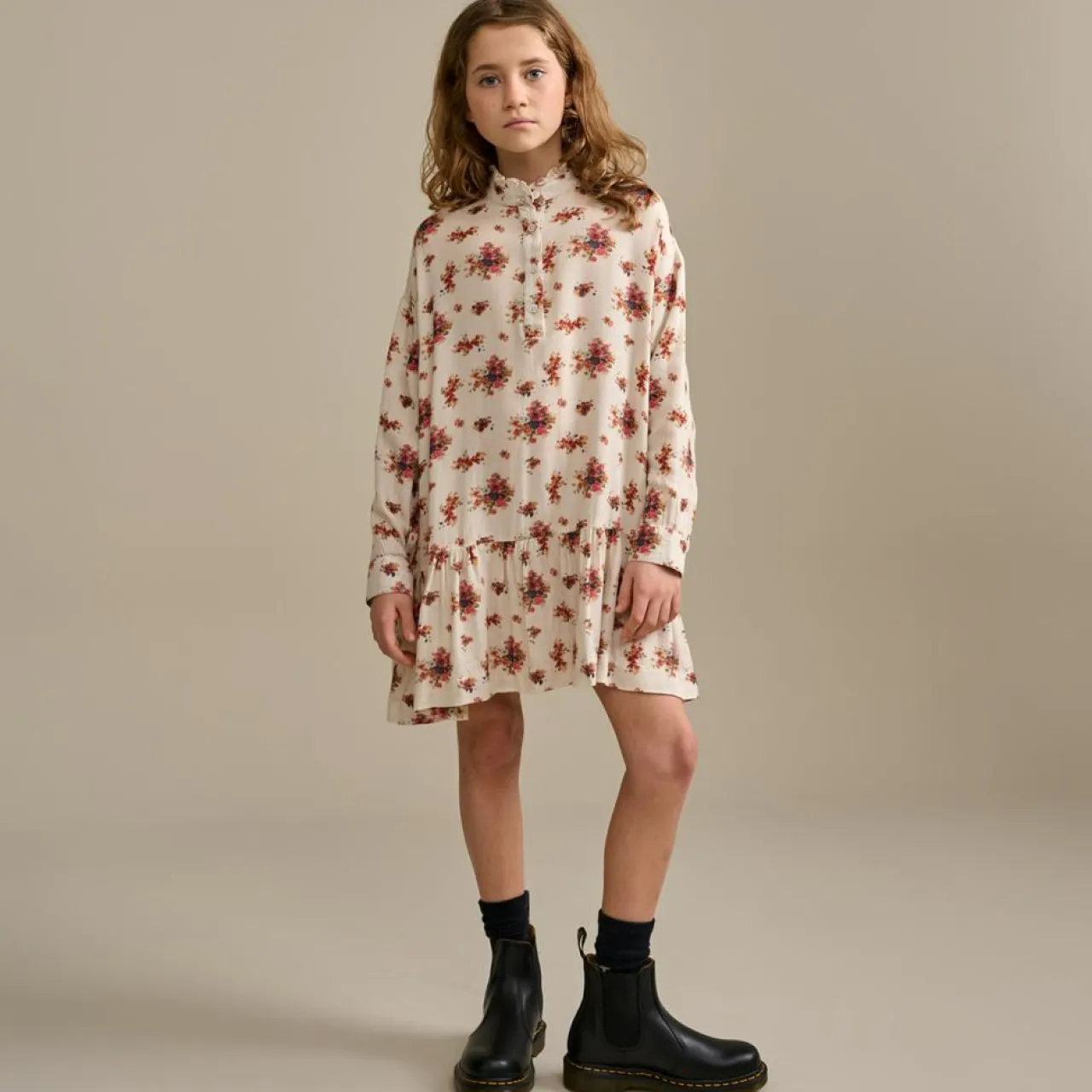 Voici ADYLLE, une robe d’inspiration vintage un peu bohème qui combine une coupe ample, une jupe à volants, un col relevé semi-ouvert et des épaules tombantes avec un mélange léger de viscose dans un motif floral vintage