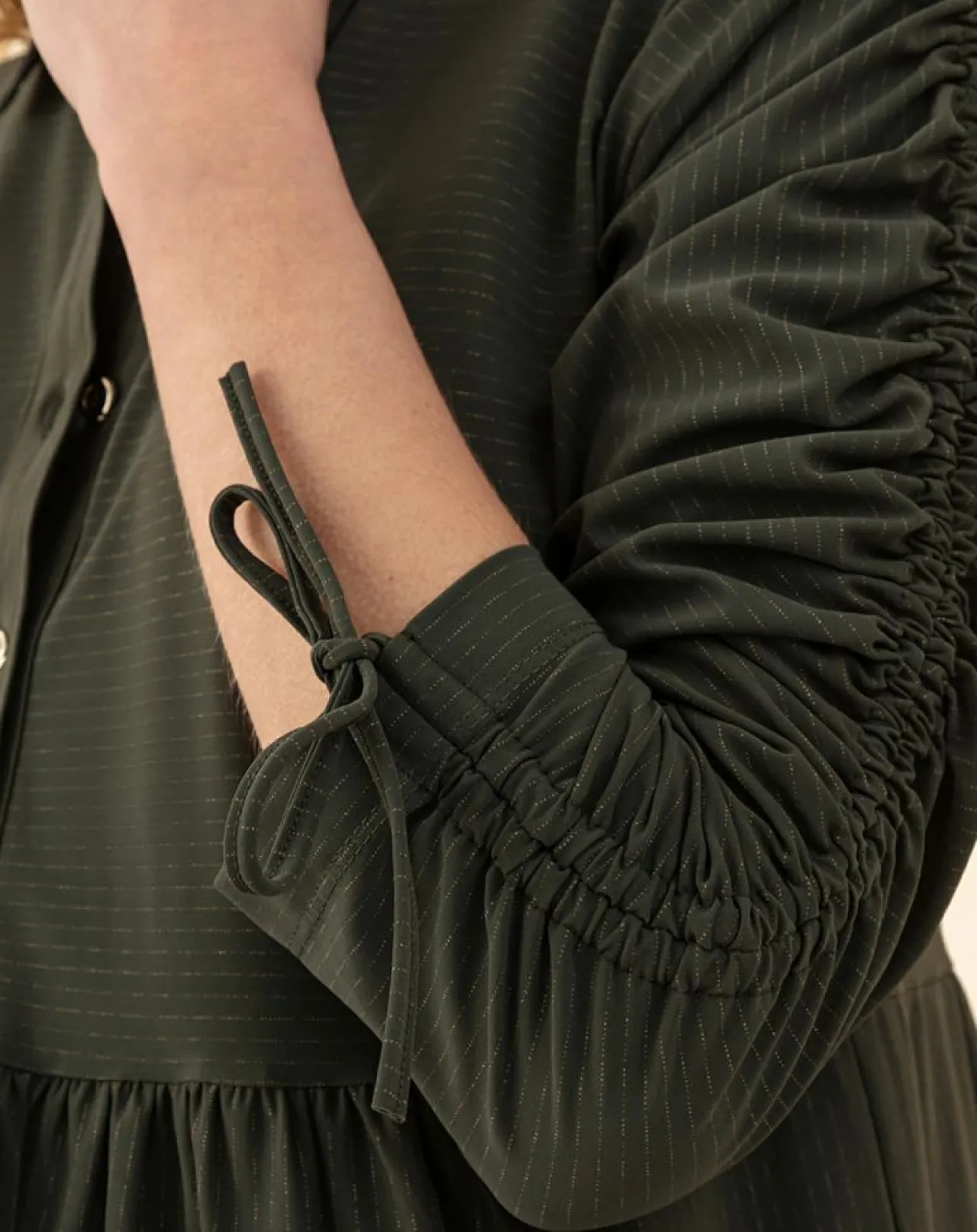 Découvrez notre robe kaki à rayures dorées en jersey technique, une pièce unique qui vous fera briller