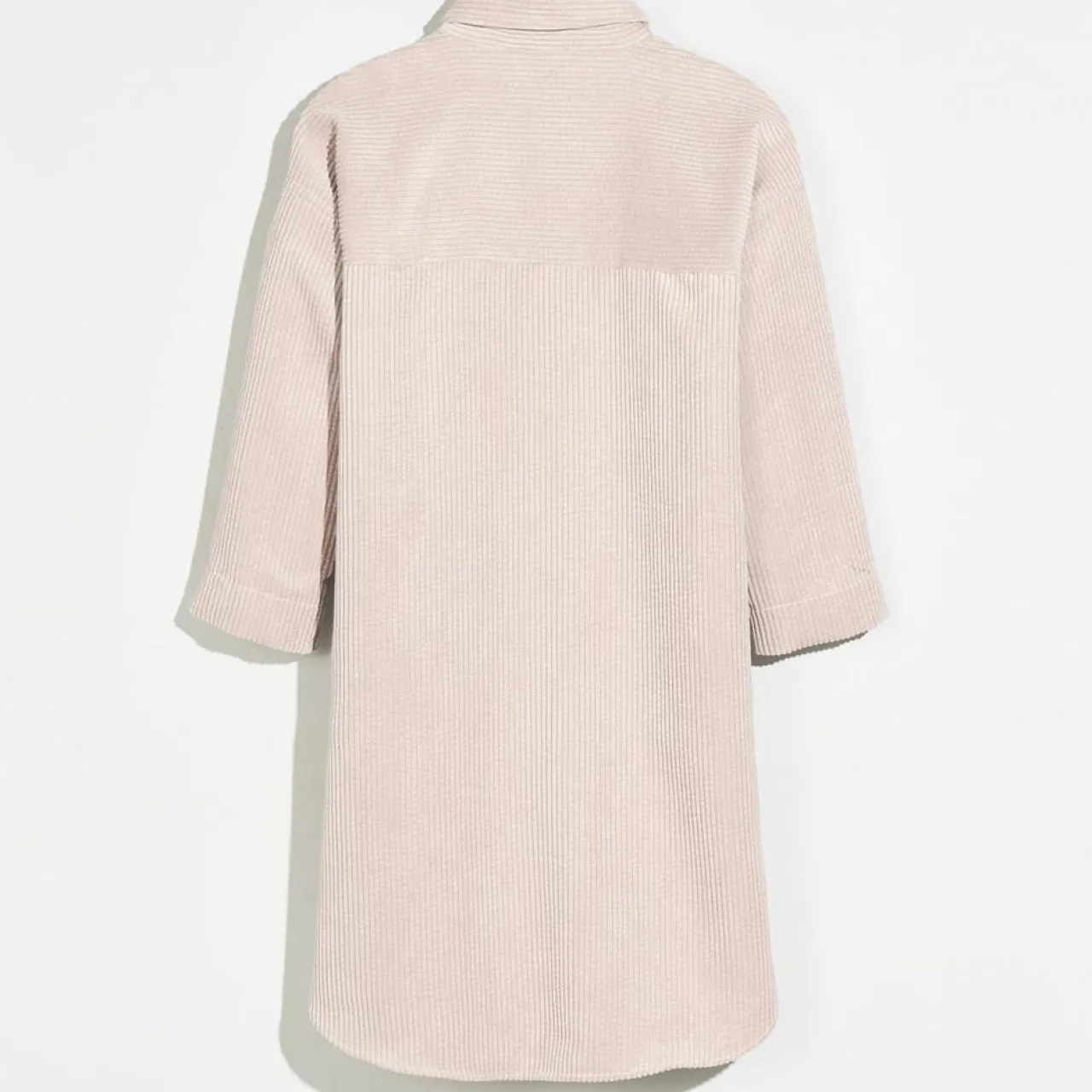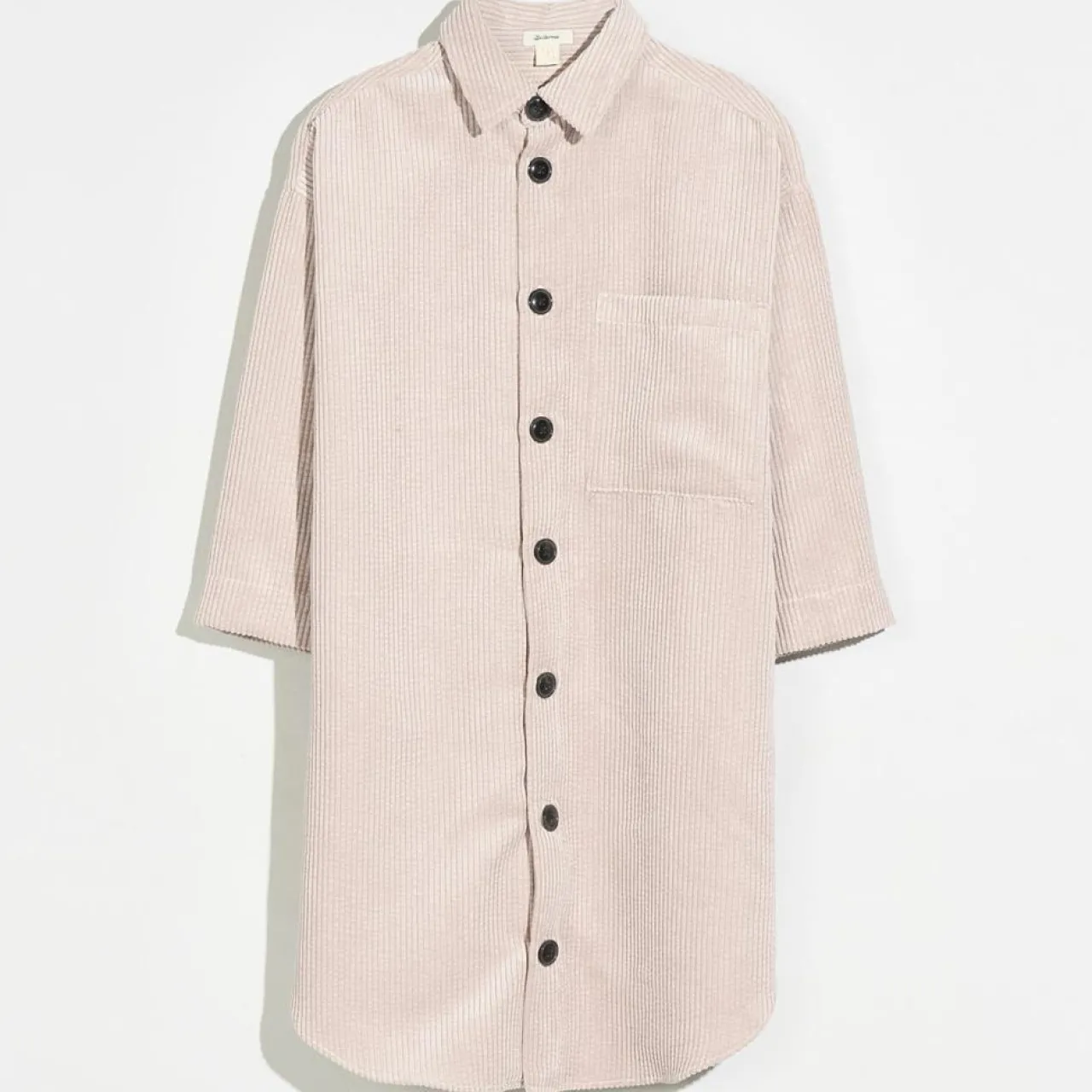 Confectionnée en velours côtelé, elle présente un bord arrondi, des manches larges, une grande poche plaquée et des poches latérales pratiques