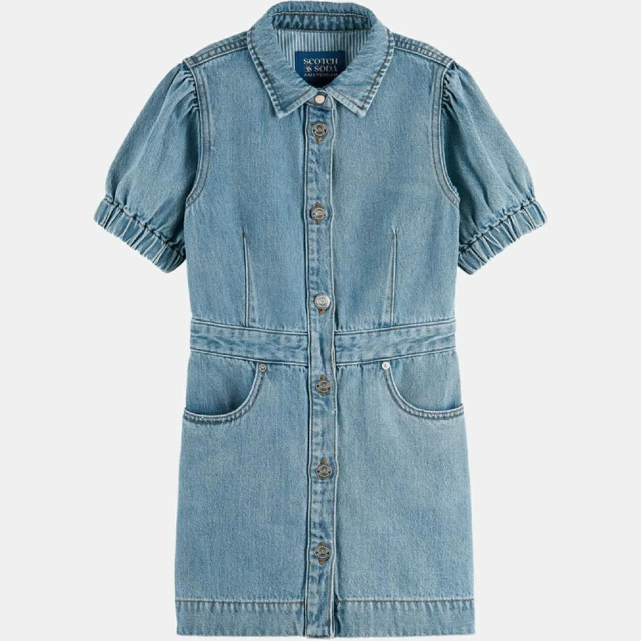 Cette robe ajustée et courte Scotch & Soda composée de coton présente un col classique, une fermeture boutonnée, des manches courtes ballons et des poches cavalières sur le devant.