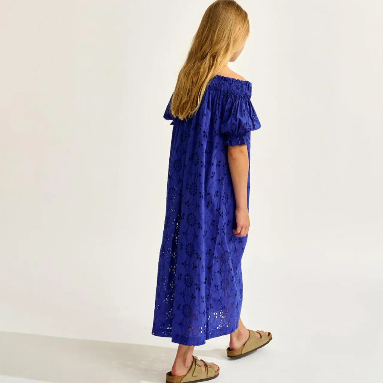 Confectionnée en popeline de pur coton avec des broderies anglaises all-over, elle présente une coupe à épaules dénudées avec des manches bouffantes et une longue jupe fluide