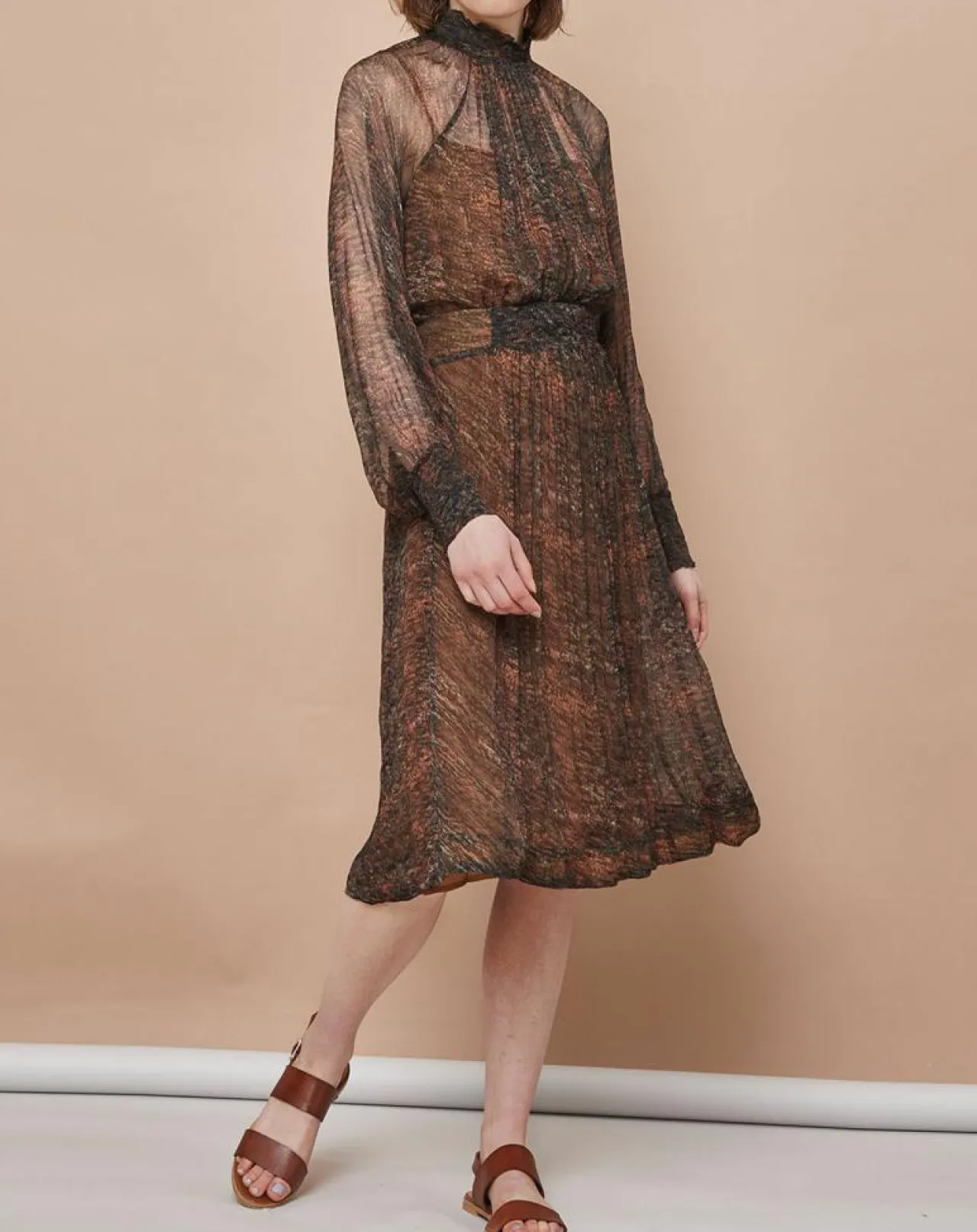 Son encolure délicatement montante contrebalance avec une jupe évasée