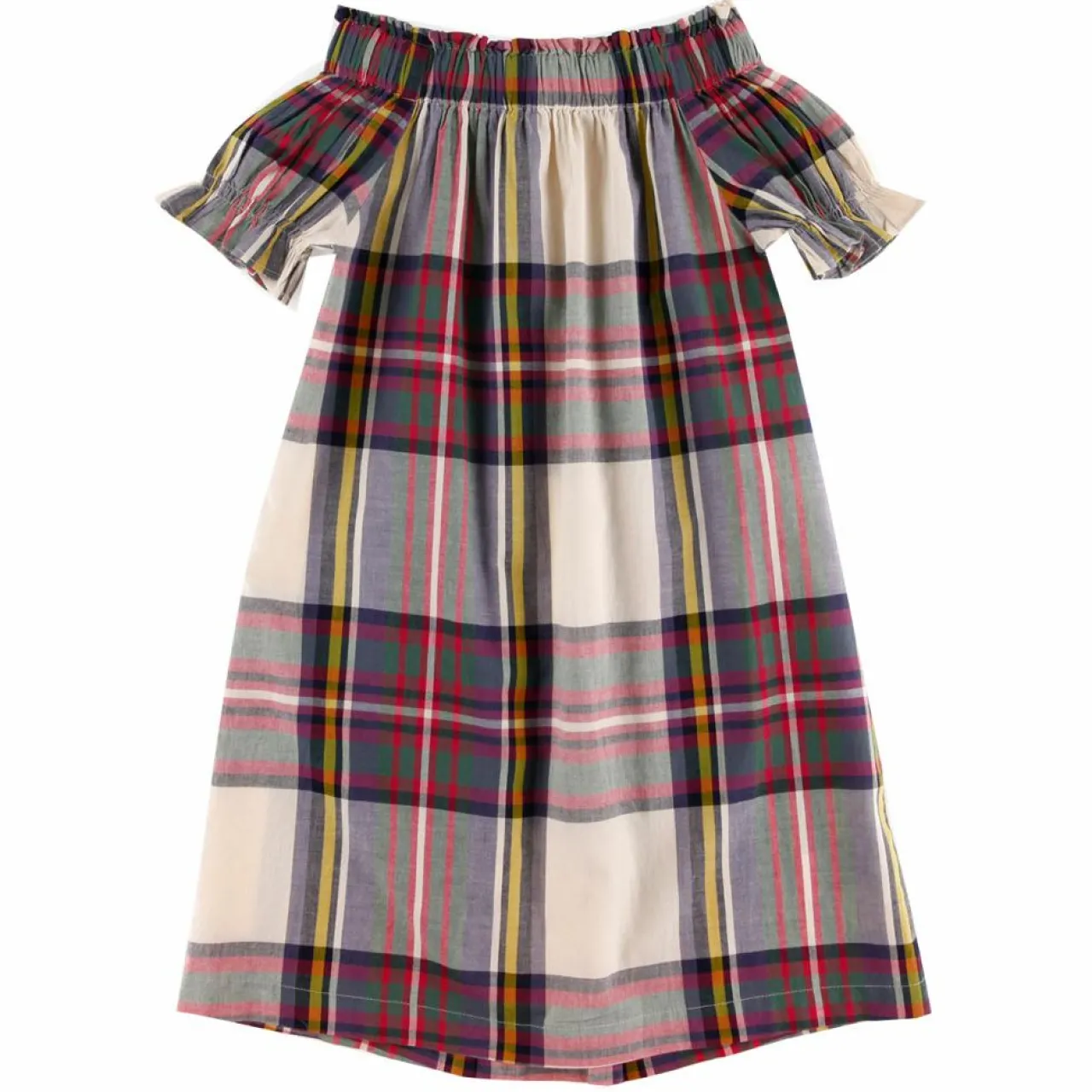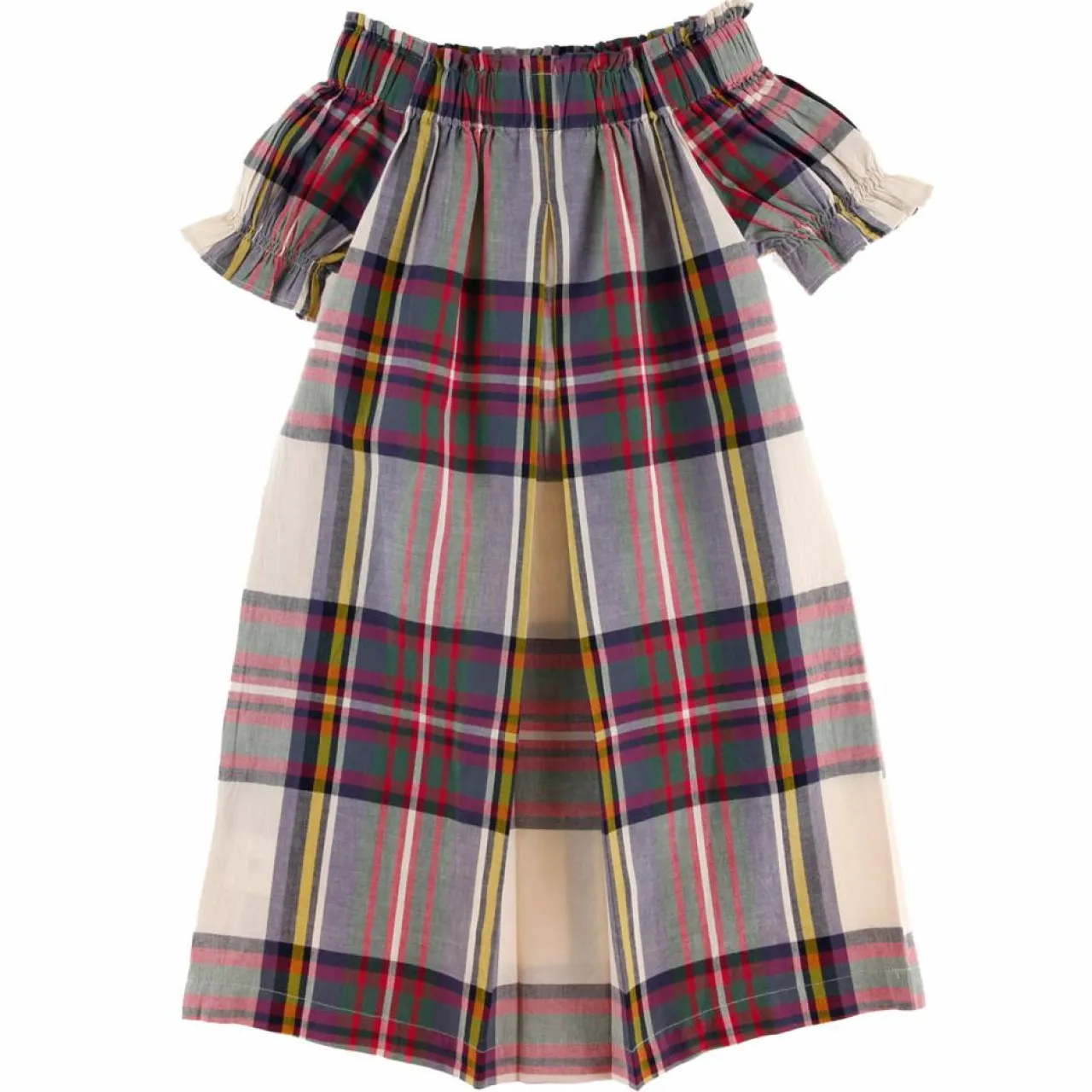 Confectionnée en pur coton avec un imprimé de style madras, elle présente une coupe à épaules dénudées avec des manches bouffantes et une longue jupe fluide