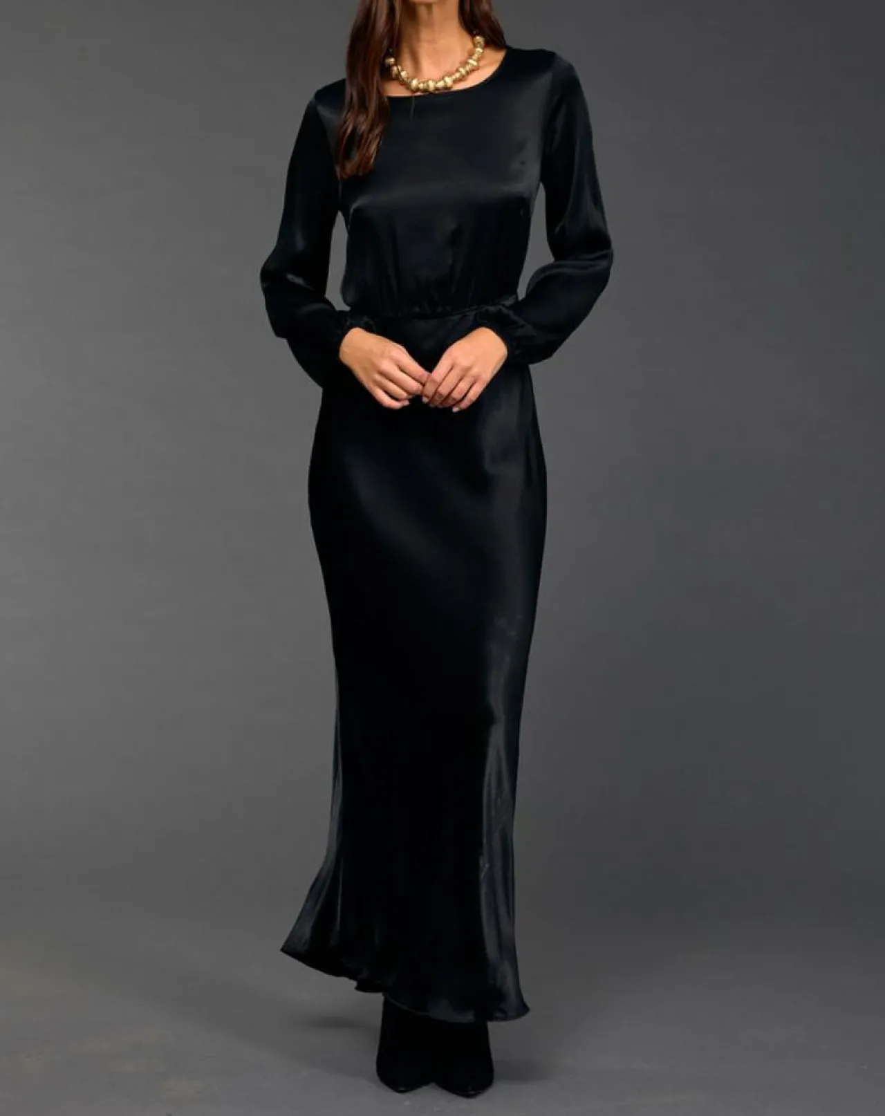 Cette robe longue fittée est élégante et féminine, avec une encolure bateau chic et des manches longues élastiquées au bas