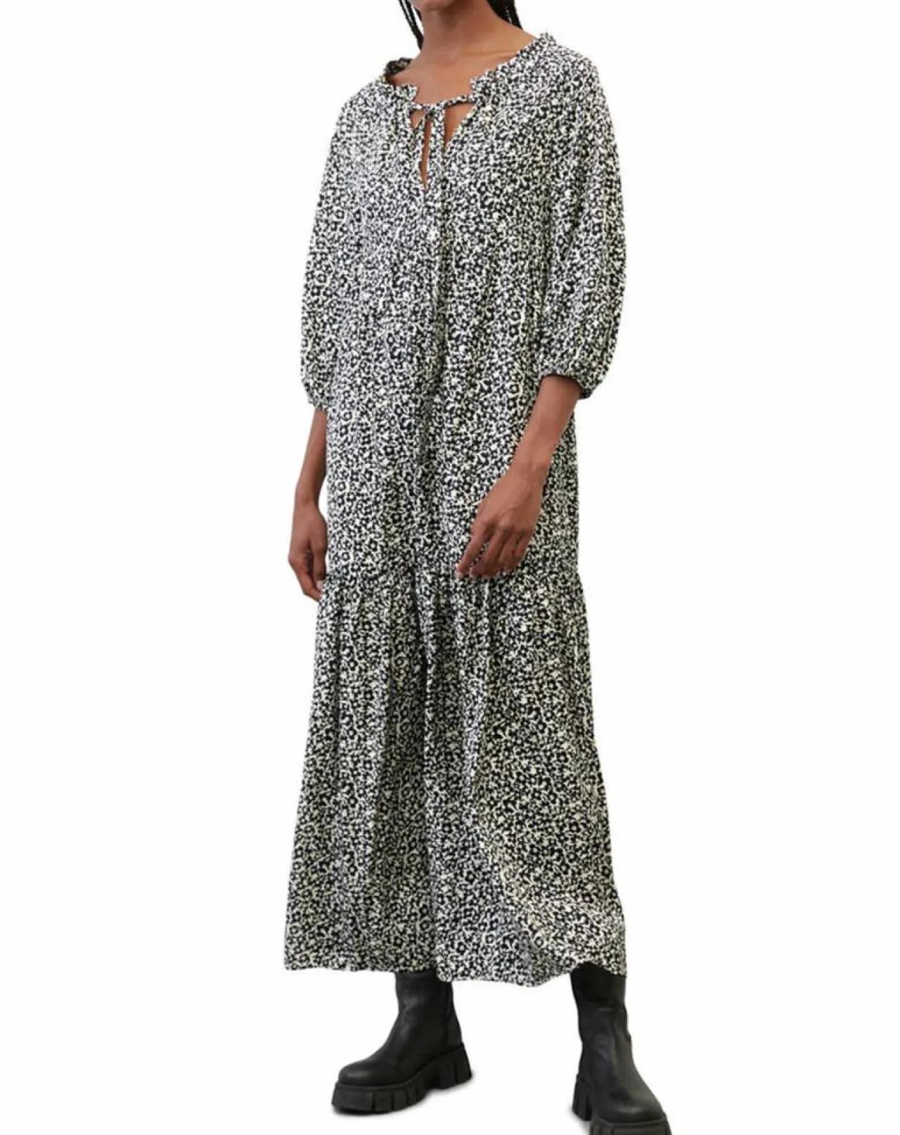 De style bohème féminin aux accents rétro des années 70, cette maxi-robe à volants finement imprimée est confectionnée en pur twill de viscose fluide.