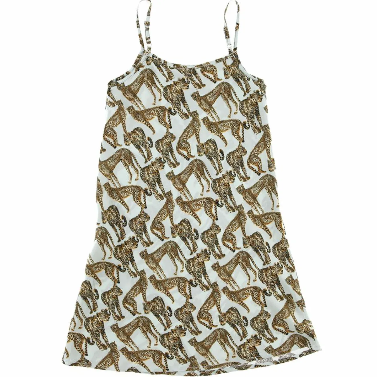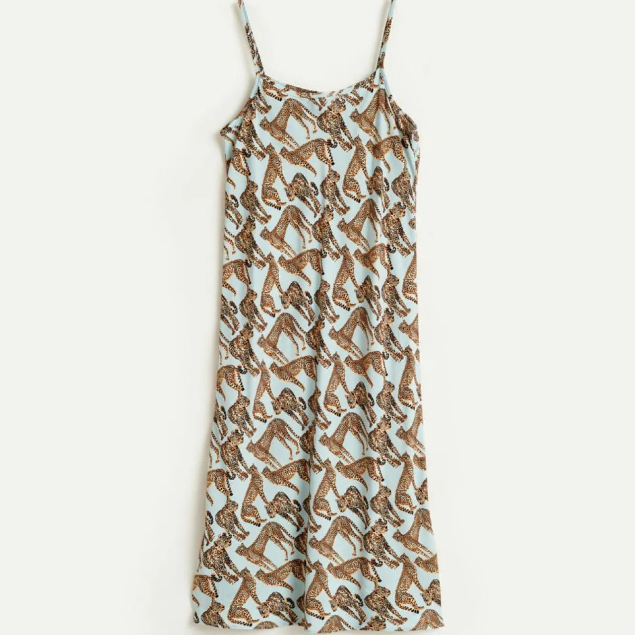 C’est la robe d’été par excellence, bretelles fines ajustables, longueur sous le genou, elle est confectionnée dans une viscose légère à l’imprimé léopard audacieux