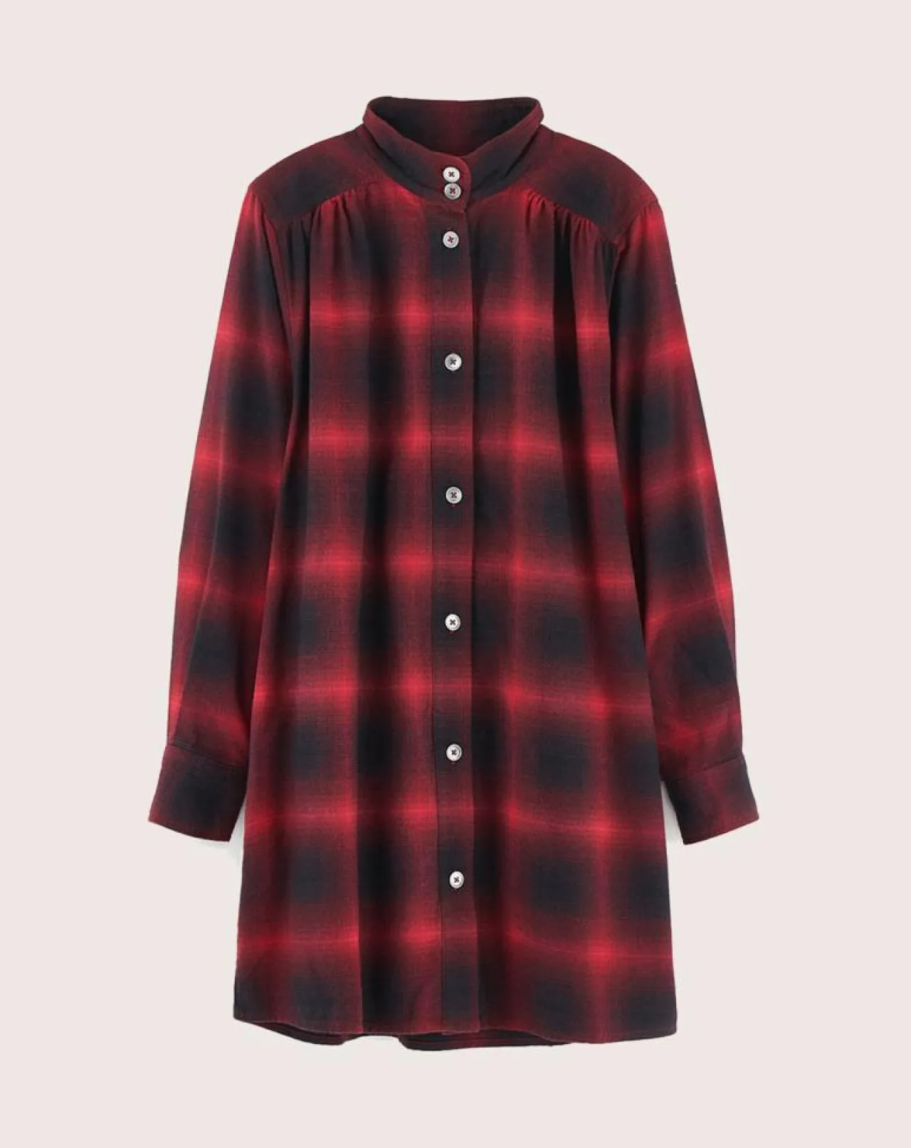 Mini-robe chemise à col montant et détails froncés en coton brossé à carreaux rouges et noirs