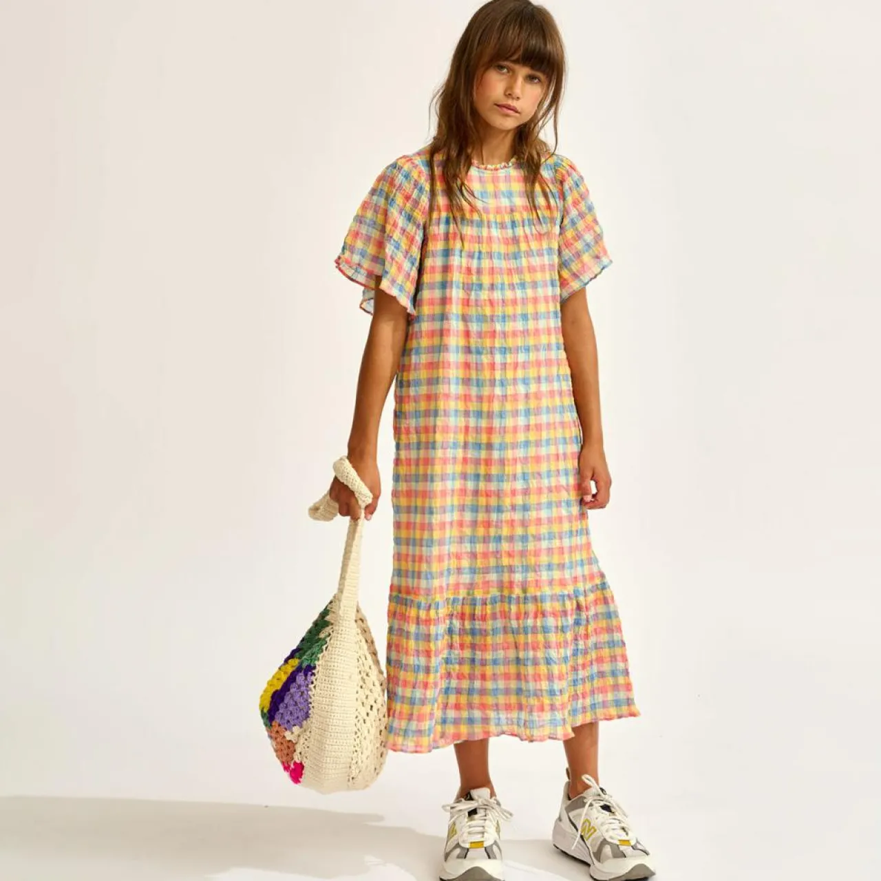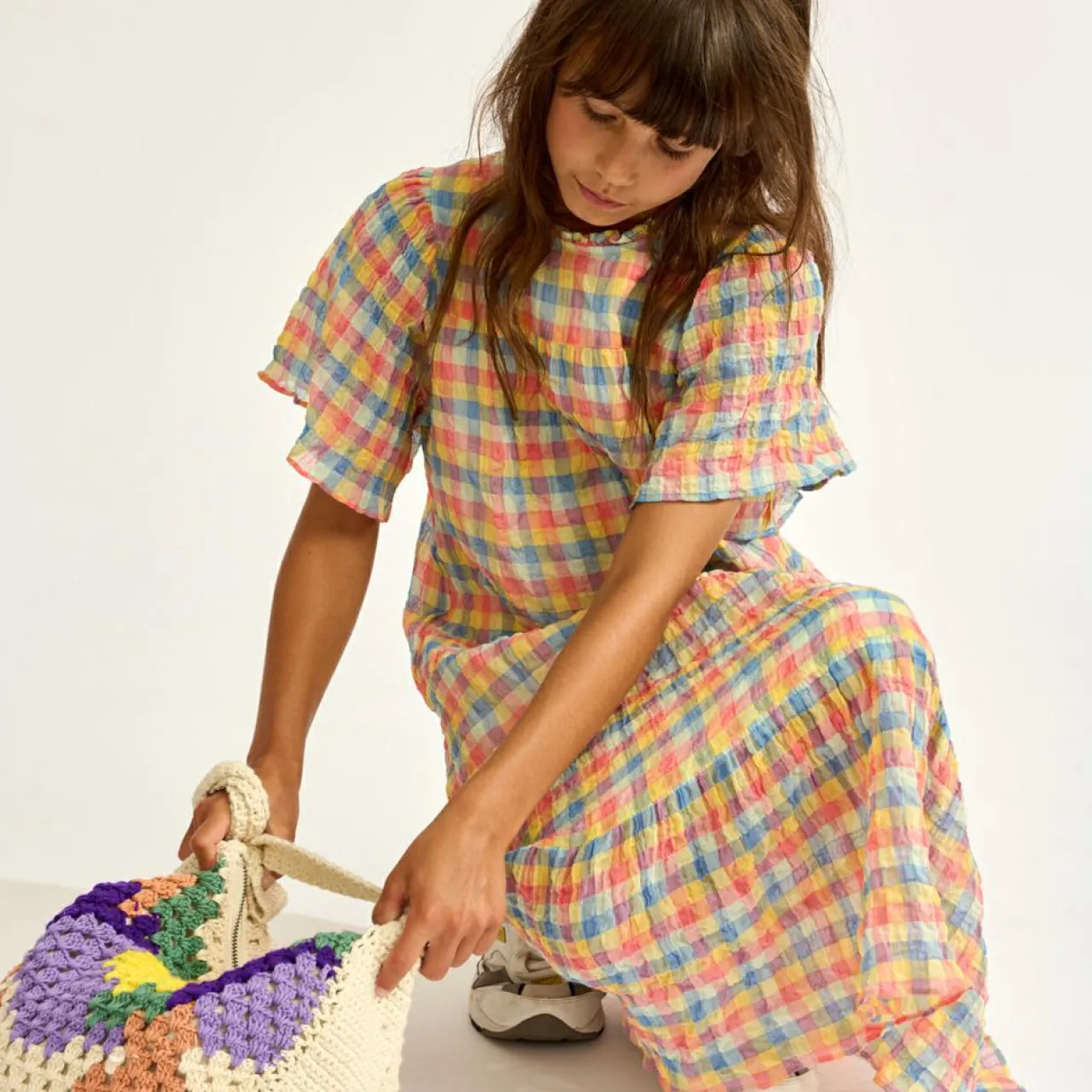 Cette robe longue en coton mélangé s’orne d’un imprimé à carreaux colorés de style madras