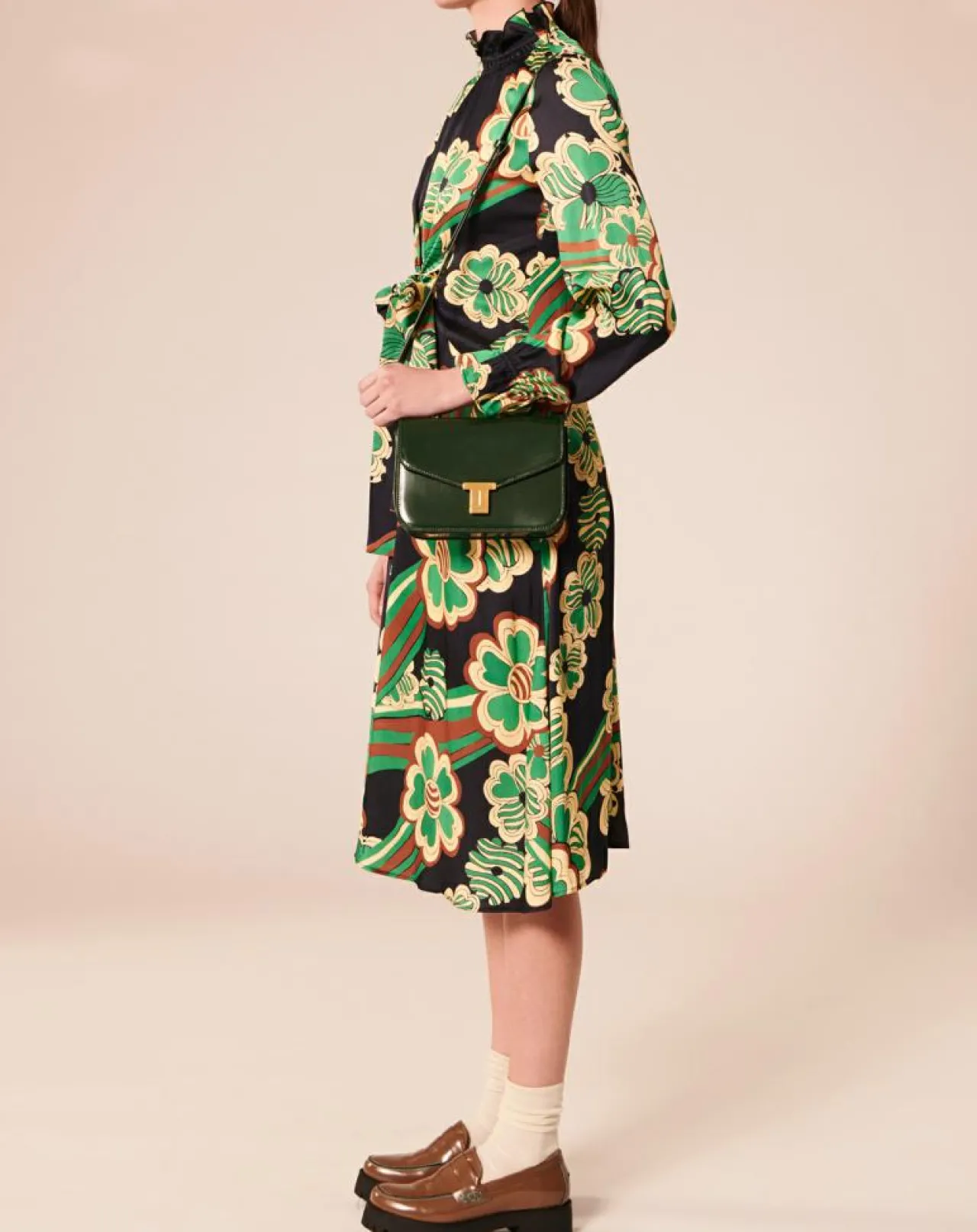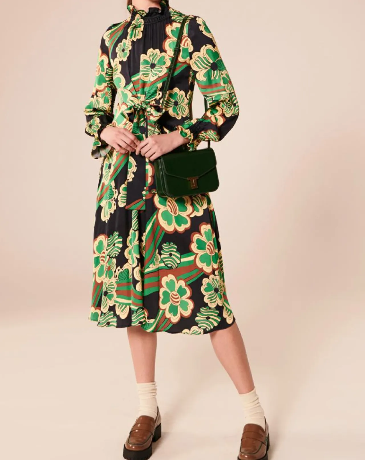 Cette robe couleur bleu nocturne longue imprimée de grosses fleurs possède un col montant et des manches longues