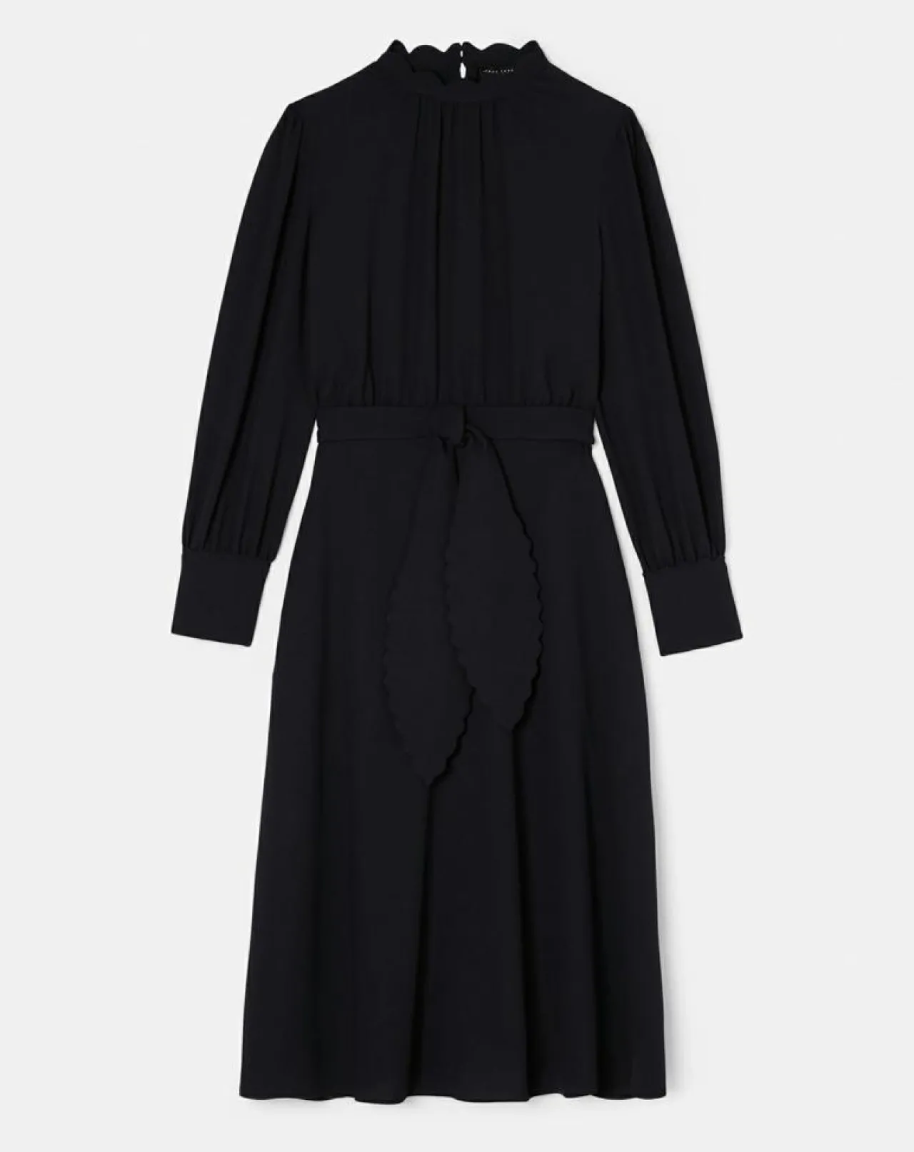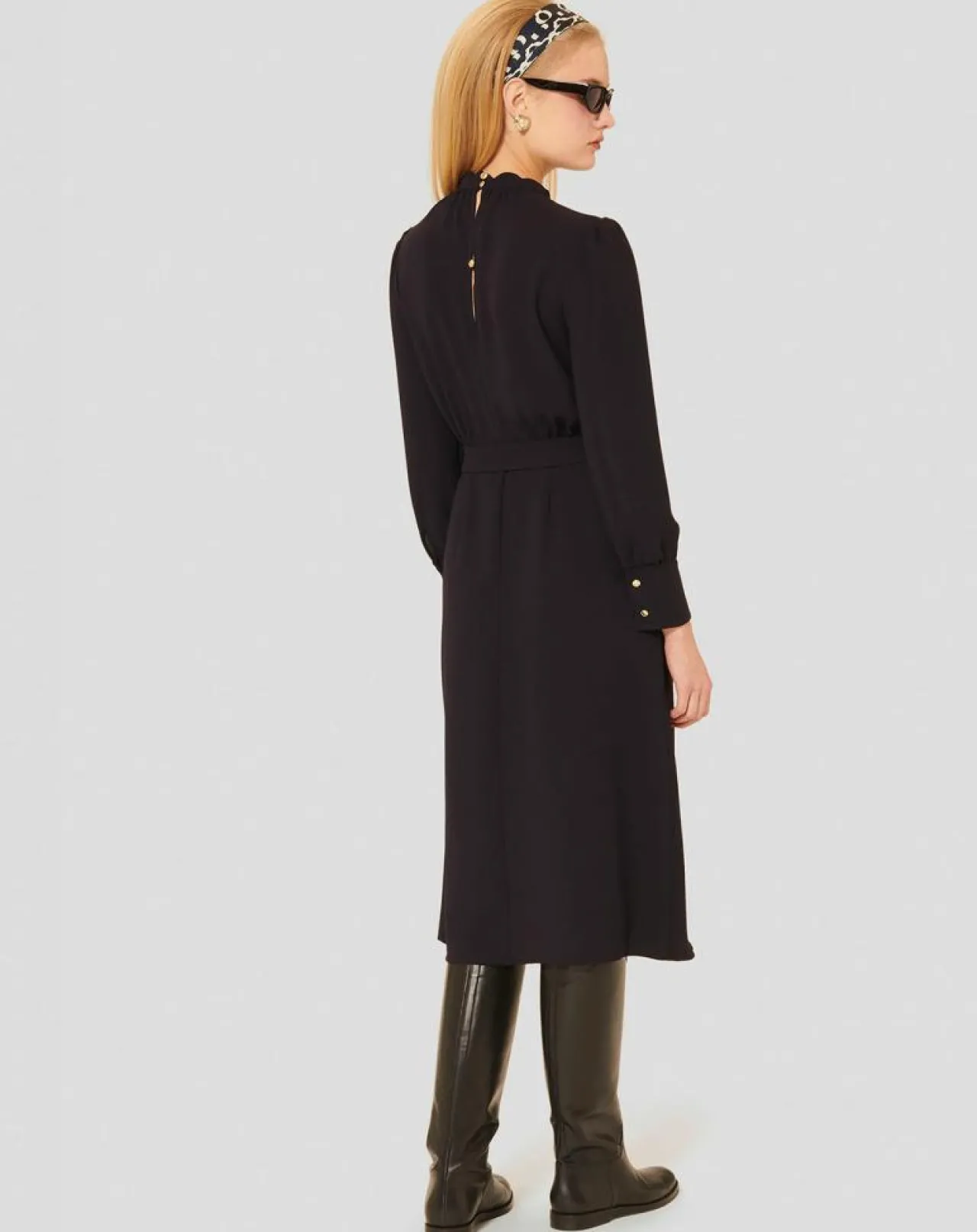 Cette robe mi-longue couleur bleu nuit en crêpe possède un col rond festonnée et des manches longues ballons boutonnées aux poignets