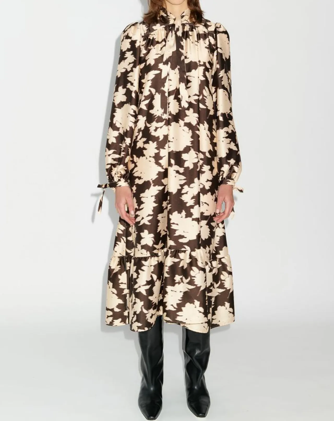 On adopte cette direction en optant pour un tissu fluide et large orné d’un imprimé beige et chocolat