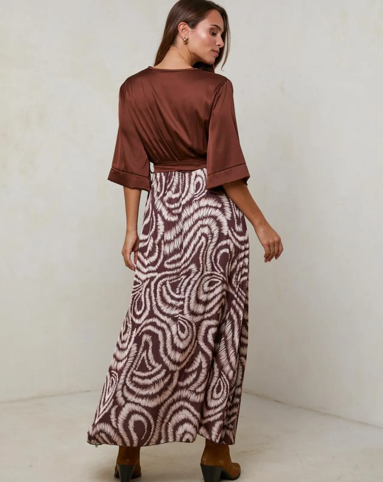 Robe longue col V manches trois quart avec motifs sur le bas ceinture à la taille