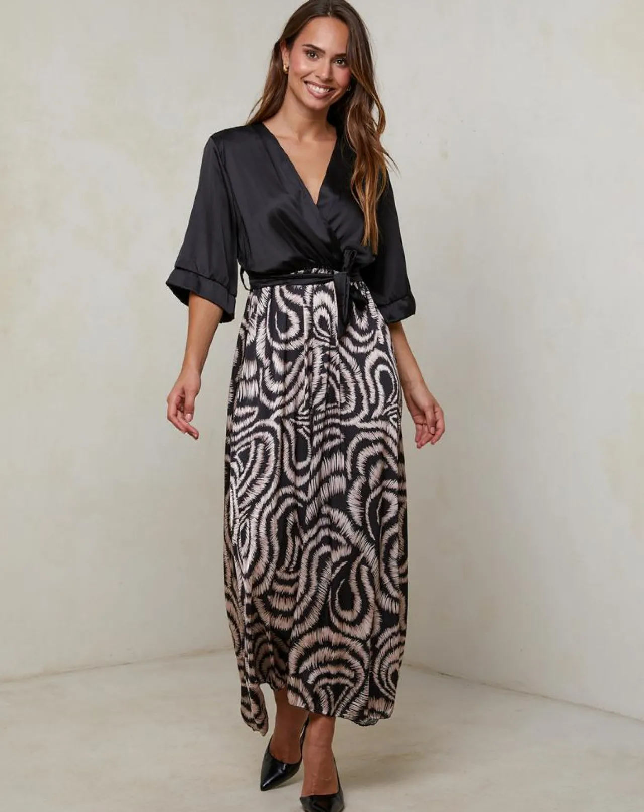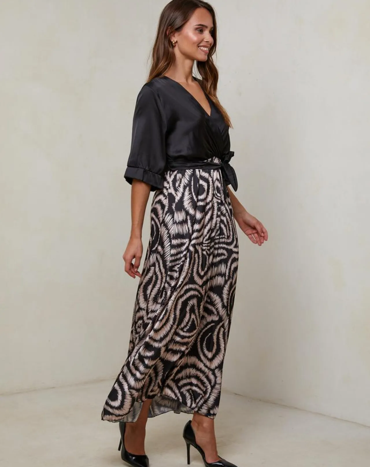 Robe longue col V manches trois quart avec motifs sur le bas ceinture à la taille