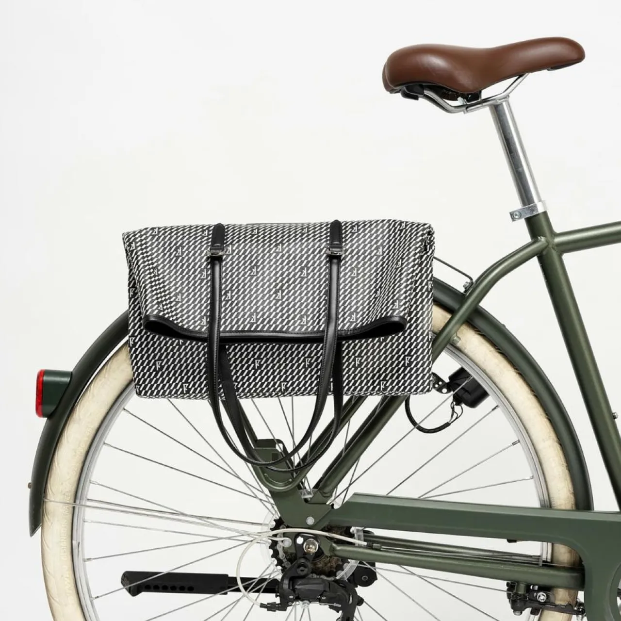 La plaque signature FARET en cuir permet à ce sac de s’accrocher de plusieurs manières sur le vélo, au niveau du panier avant ou du porte-bagage arrière