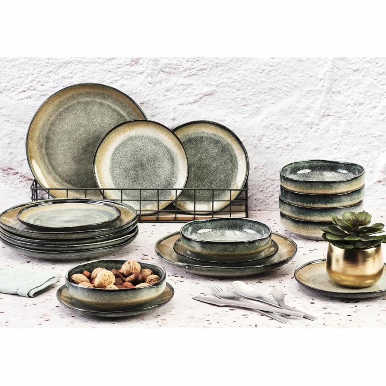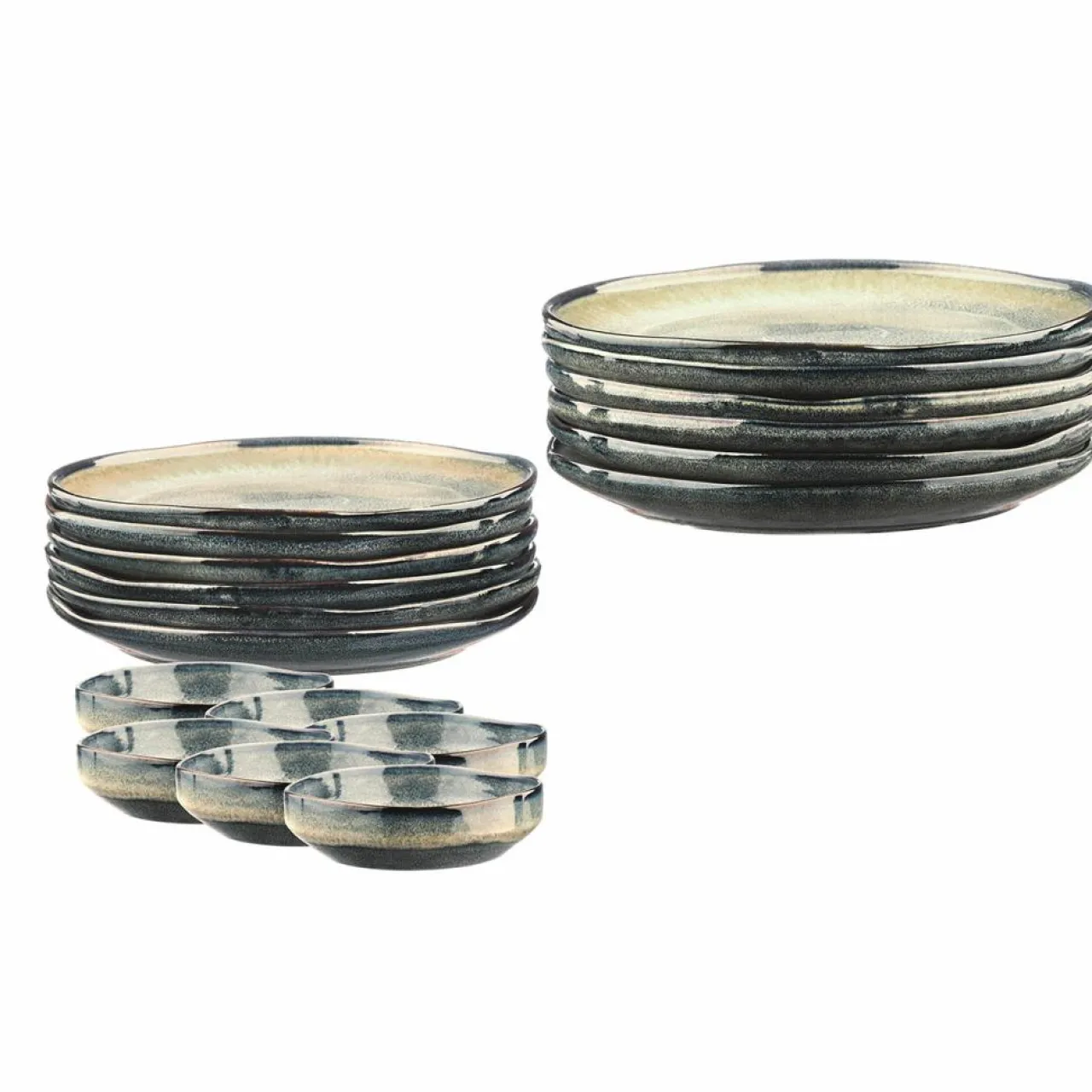 Les pièces de vaisselle sont ensuite recouvertes d’un émail d’une autre couleur pour faire ressortir l’effet réactifLe coffret contient : 6 Assiettes D.27 cm + 6 Assiettes D.20.5 cm + 6 Bols D.17 cm