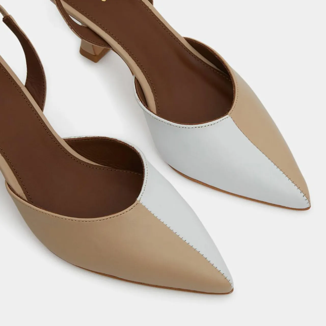 Ces slingbacks Alohas en cuir bicolore sont munies d’un bout pointu, de brides ajustables à boucle sur la cheville, d’un talon moulé recouvert de cuir et d’une semelle intérieure en cuir