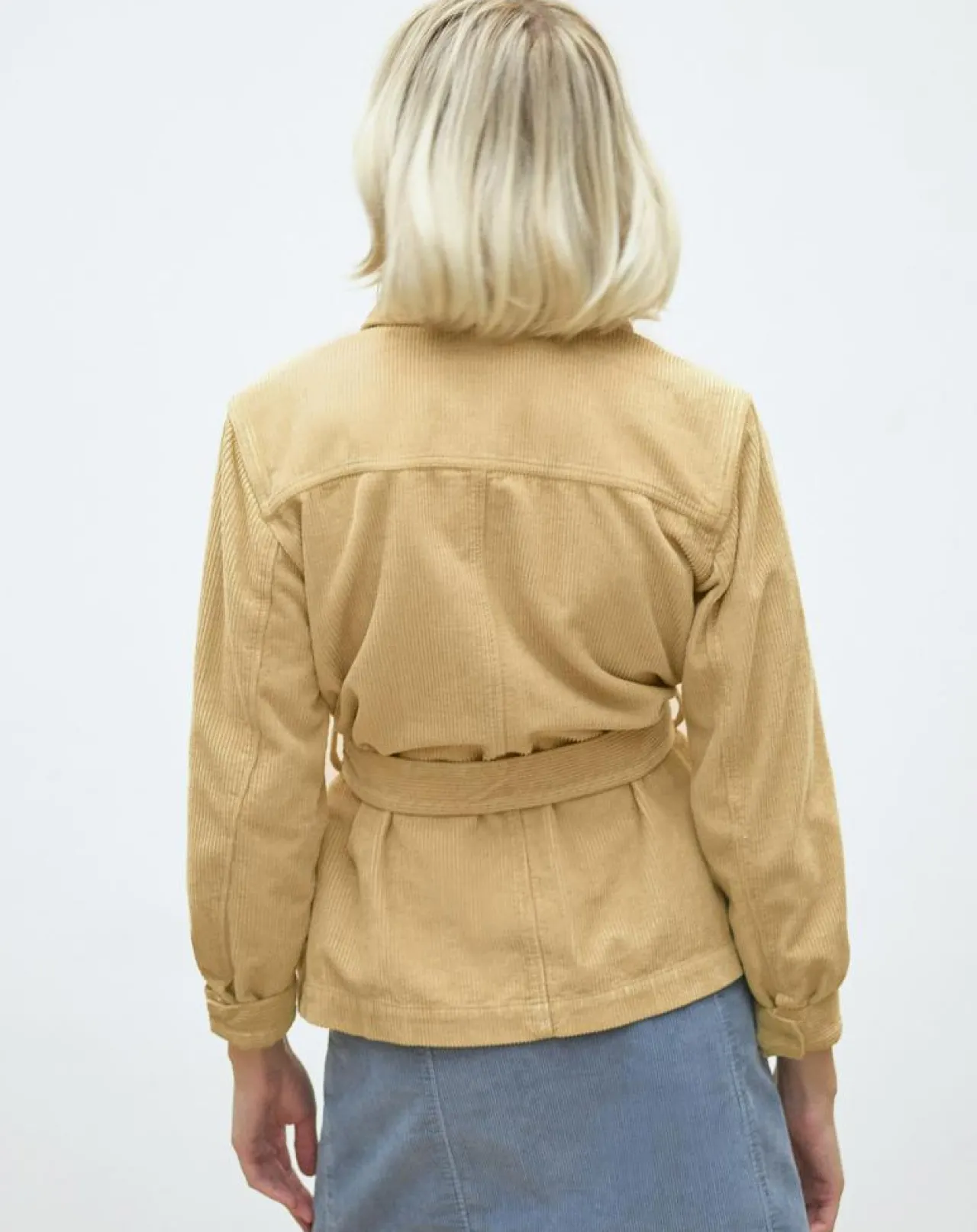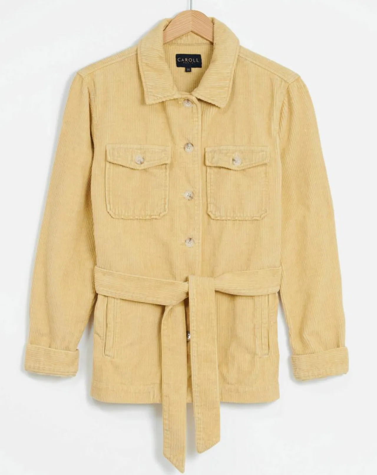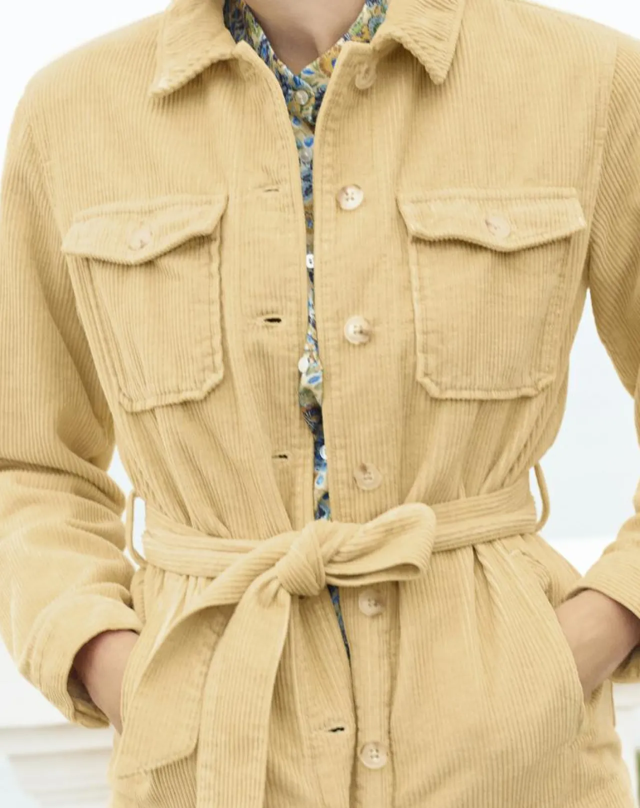 Cette surchemise en velours côtelé jaune citron est nouée à la taille par une ceinture