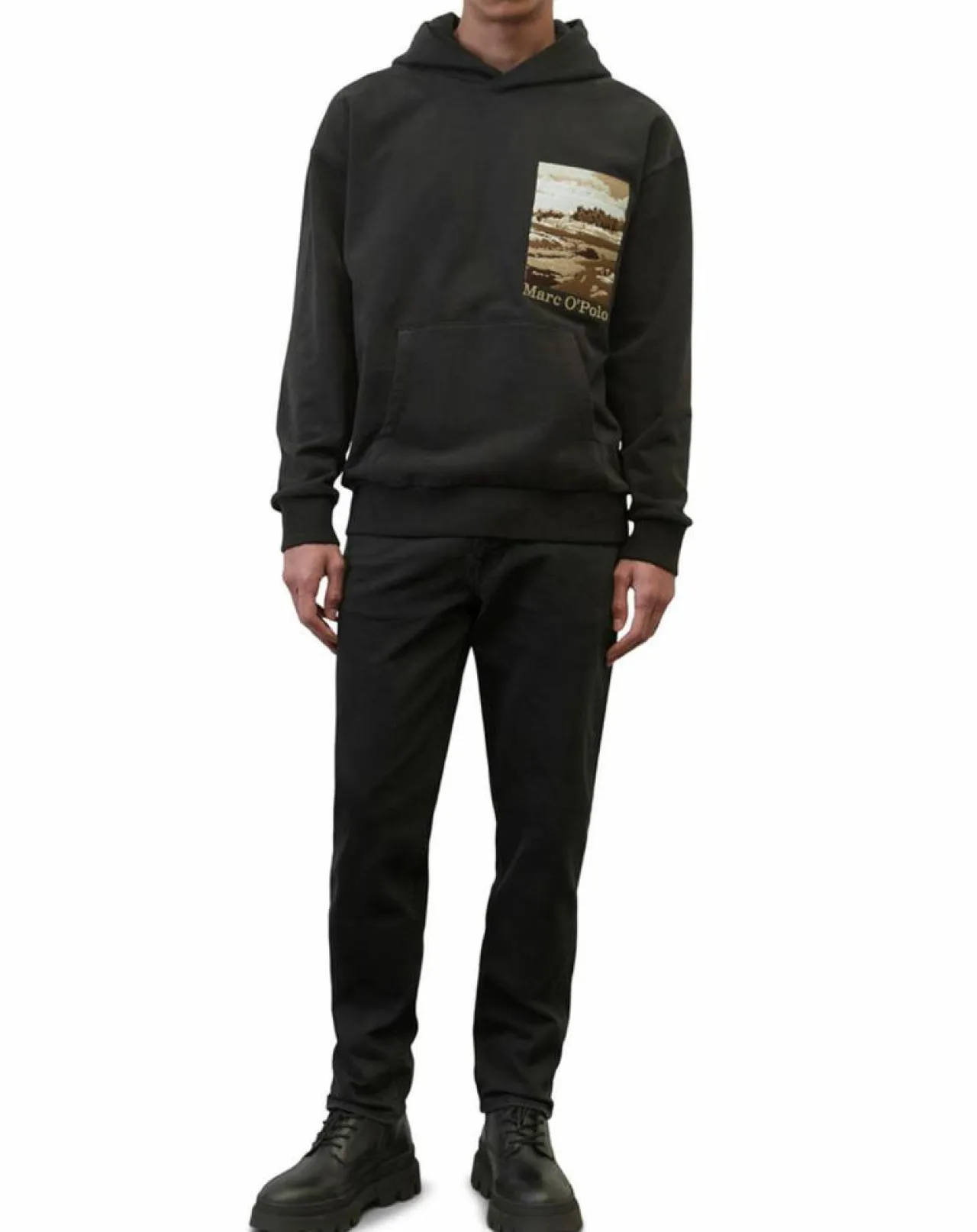 Il arbore une belle broderie compacte de paysages et de logos : le sweat-shirt à capuche décontracté en molleton effet peau de pêche, en pur coton biologique certifié GOTS, à l’envers doux.