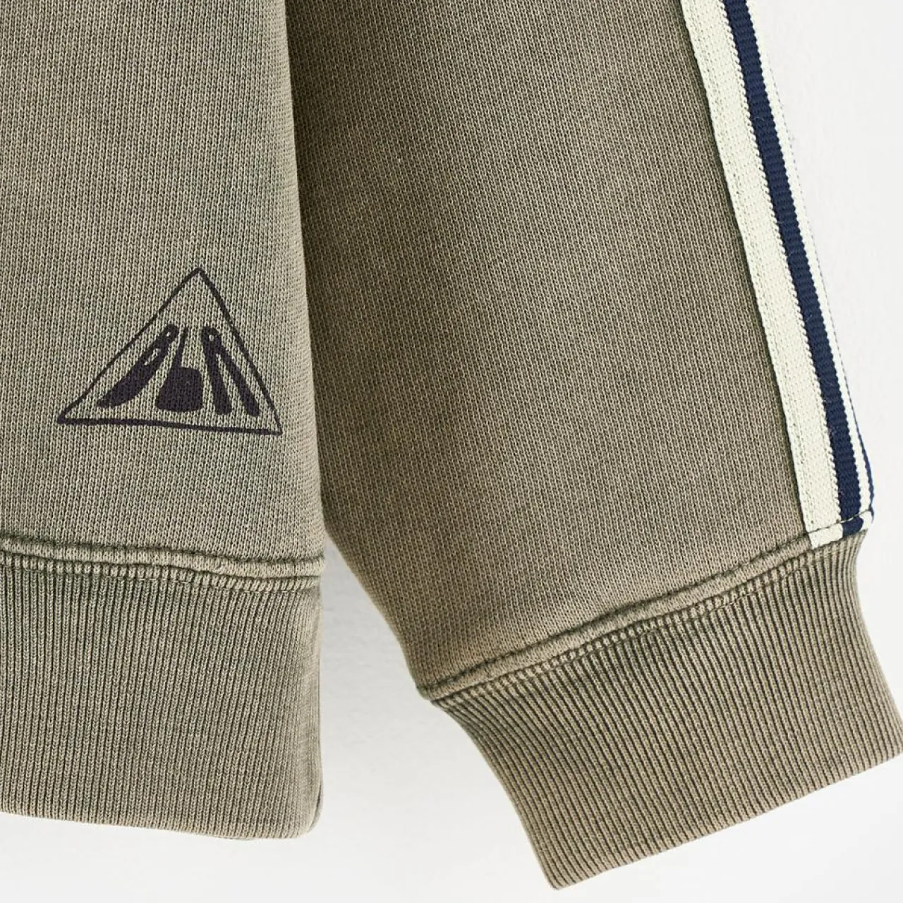 Sweatshirt à col rond, coupe classique, couleur vert mousse et bandes contrastes le long des manches