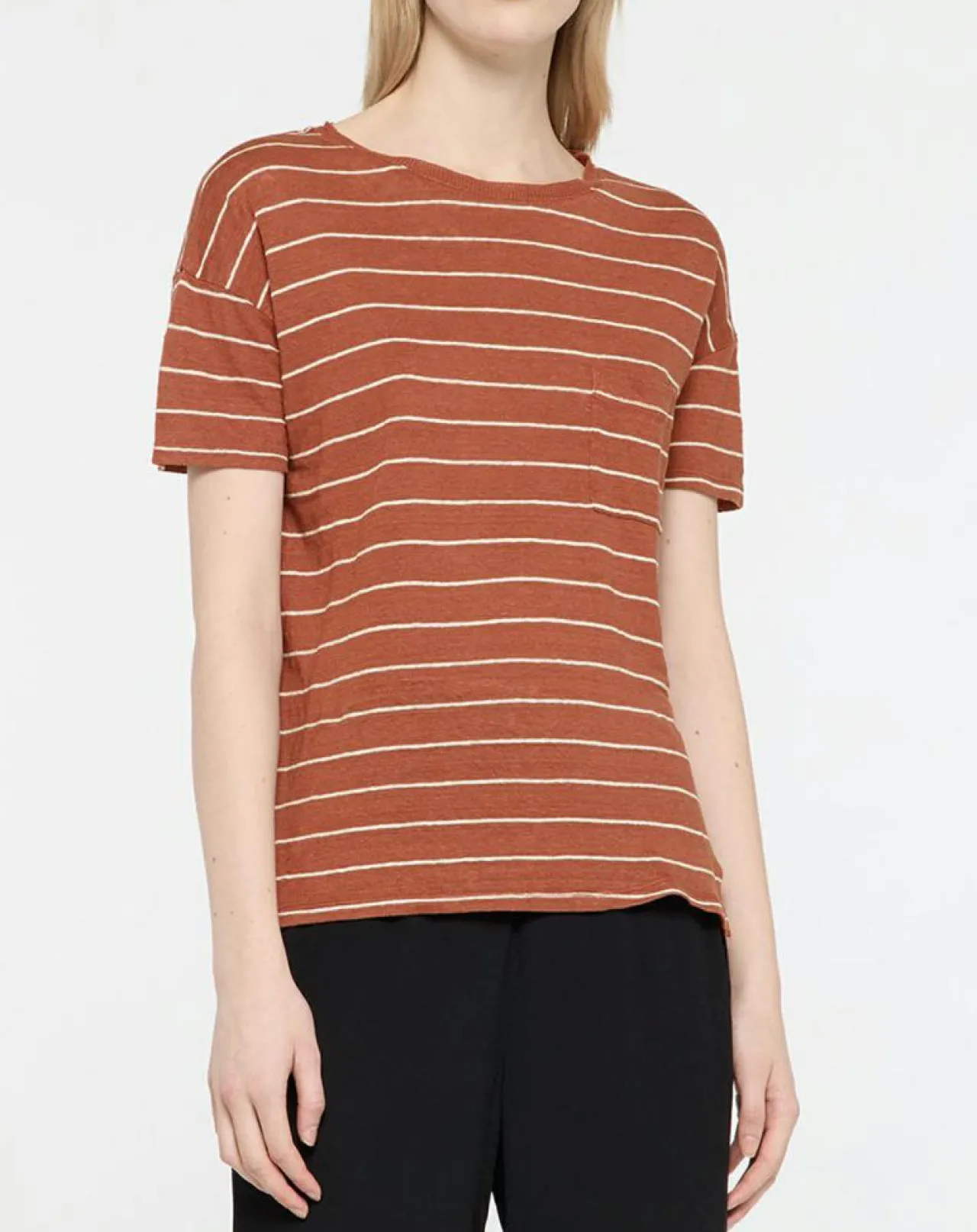 Ce t-shirt droit Yerse en lin est muni d’un imprimé à rayures, d’un col rond et d’une poche plate poitrine.