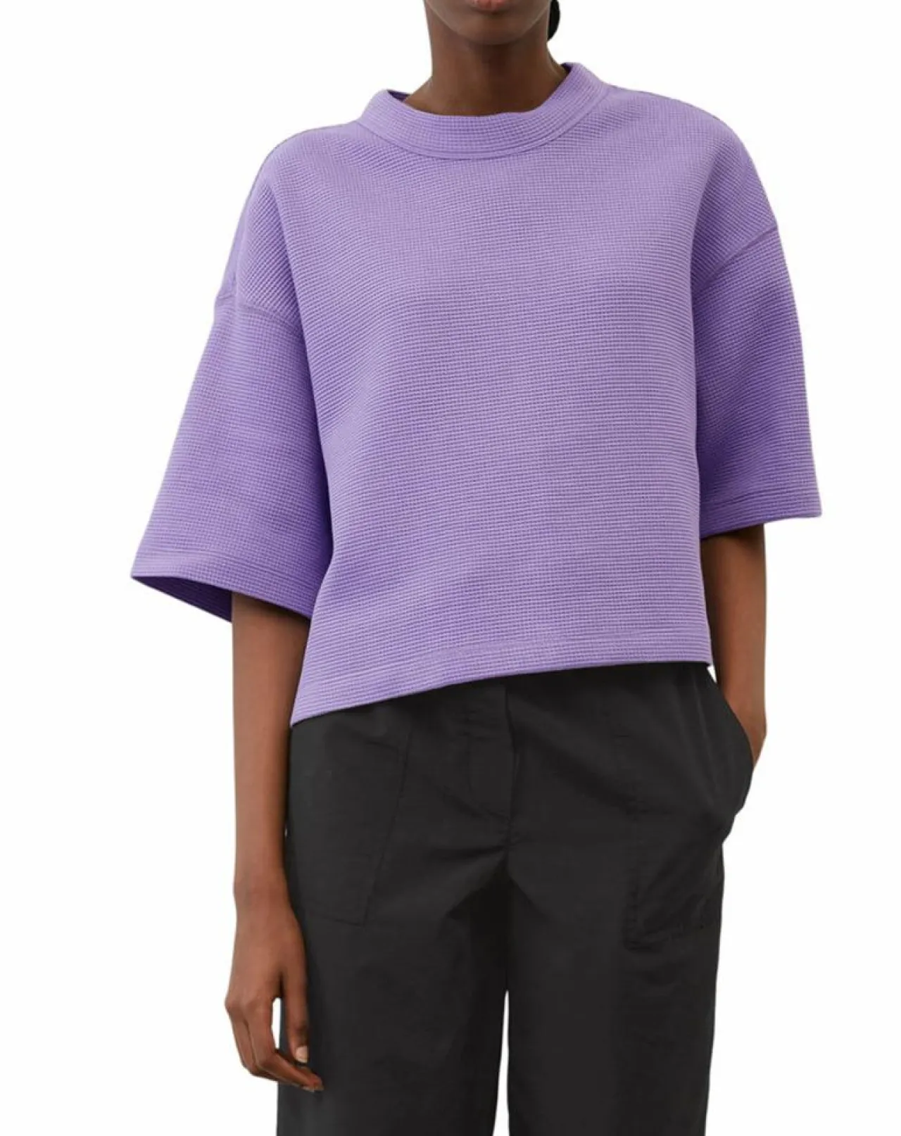 Nouveauté pour votre garde-robe : le t-shirt court et très ample orné d’une texture gaufrée moderne.